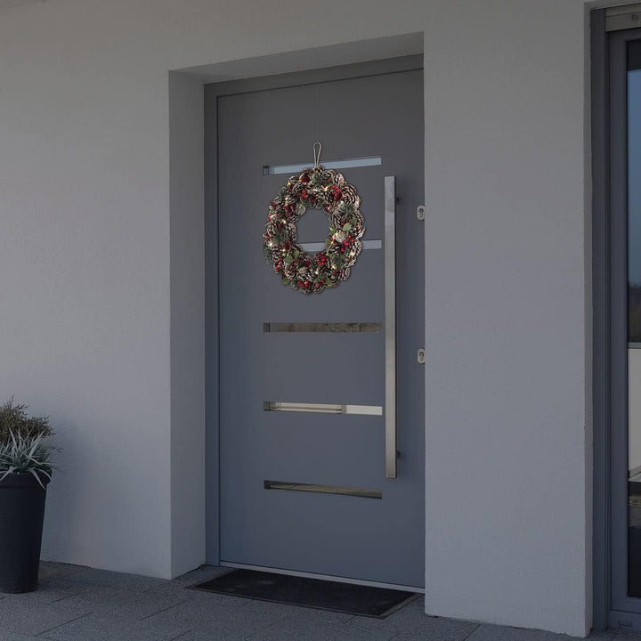- Klassischer Kranz mit roten Highlights: Deko-Tannenzweige, -Beeren, - Blätter und Tannenzapfen • Dauerbetrieb per Ein/Aus-Schalter