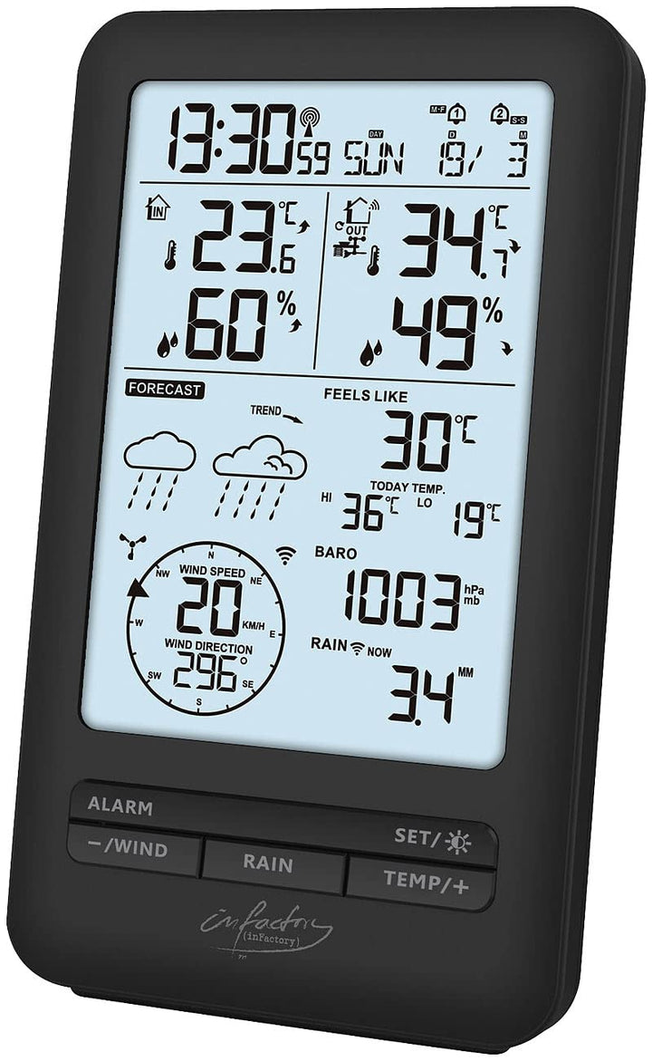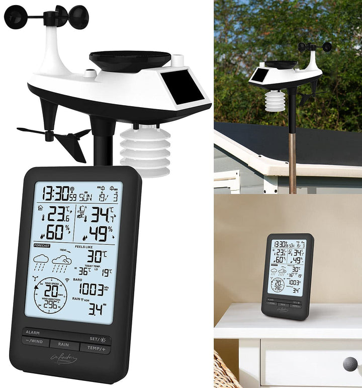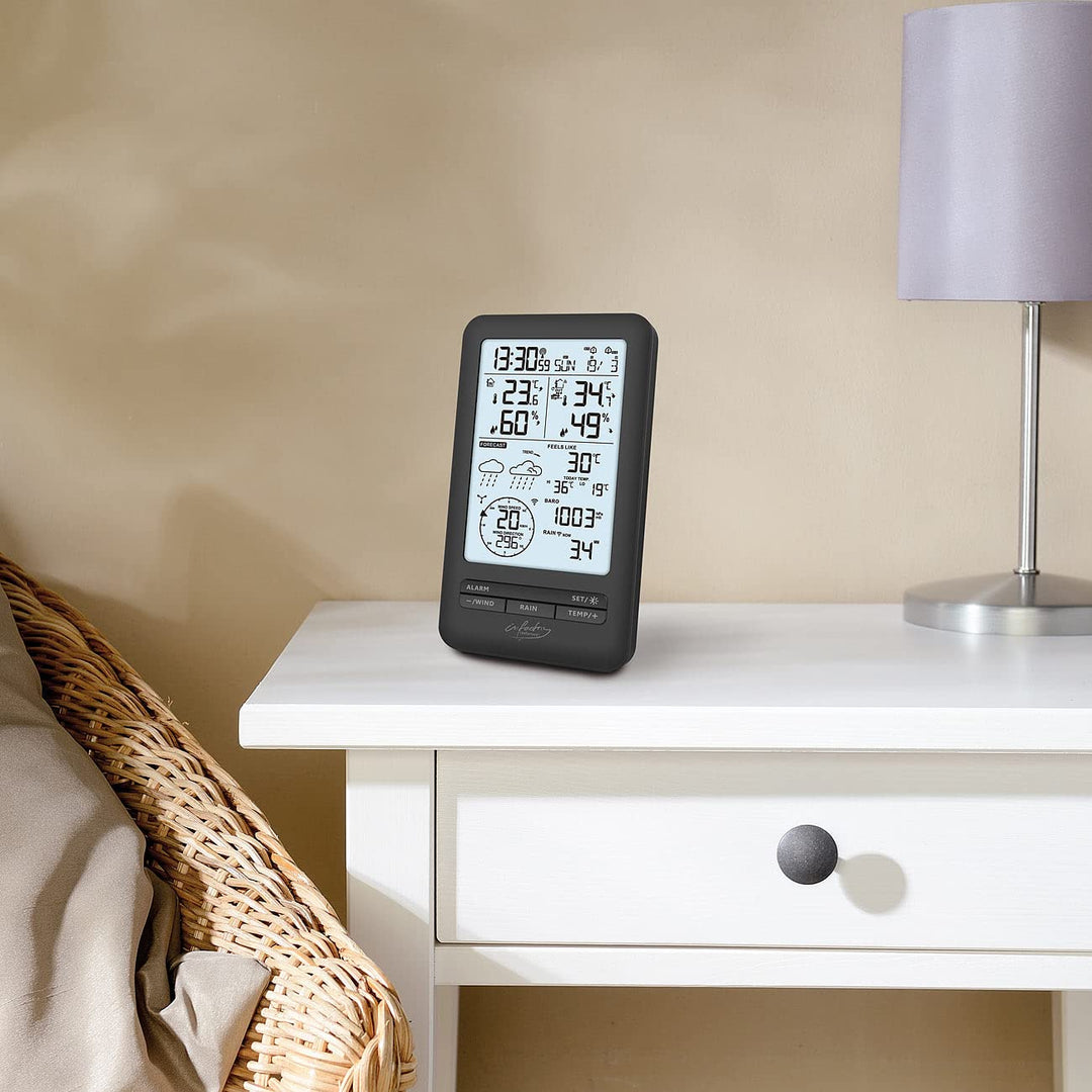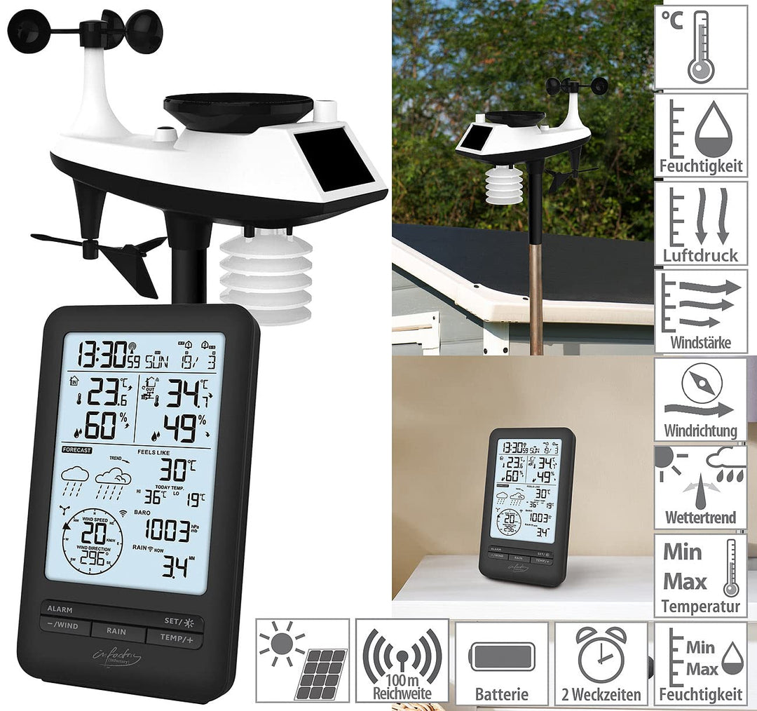 - Genaue Daten für Temperatur, Regenmenge, Windstärke/Windrichtung und Luftdruck • Hygrometer: bestimmt auch die Luftfeuchtigkeit • Wettervorschau • Funkuhr und Kalender