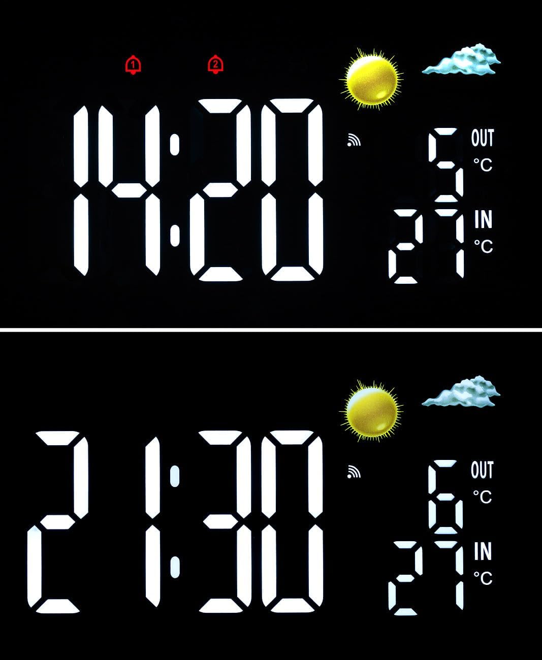 - Grosses LED-Farbdisplay: zeigt Uhrzeit, Temperatur und Luftfeuchtigkeit • 2 verschiedene Weckzeiten einstellbar, mit 10 verschiedenen Alarmtönen • Anzeige der Temperatur wahlweise in °C / °F • Kalenderfunktion mit Datum und Wochentag •