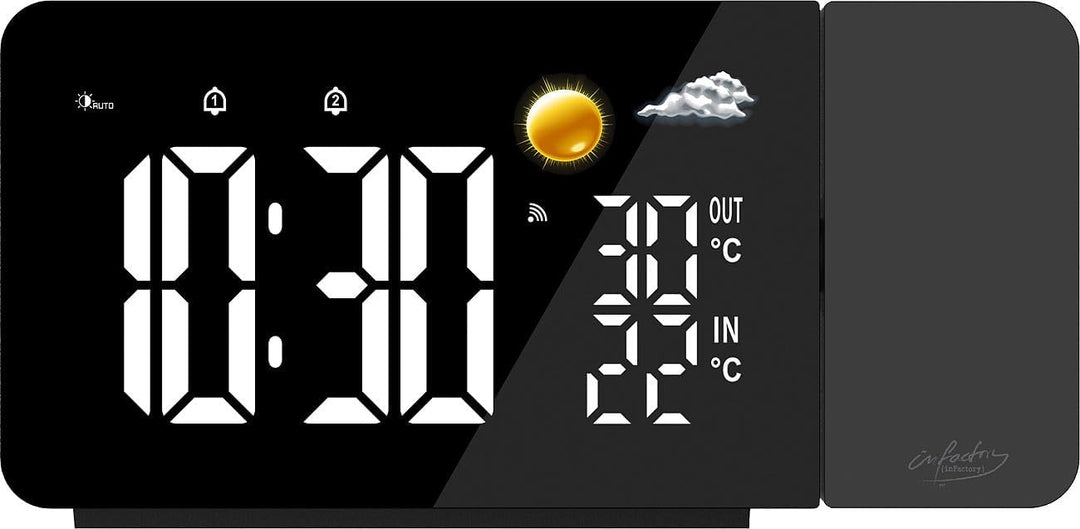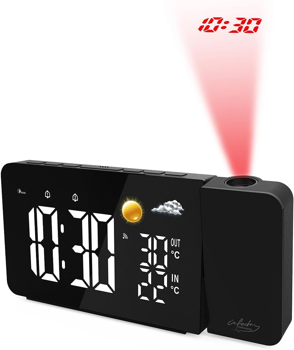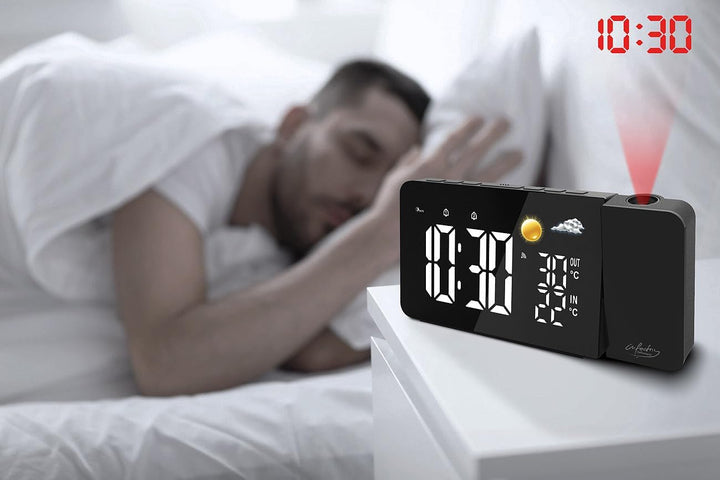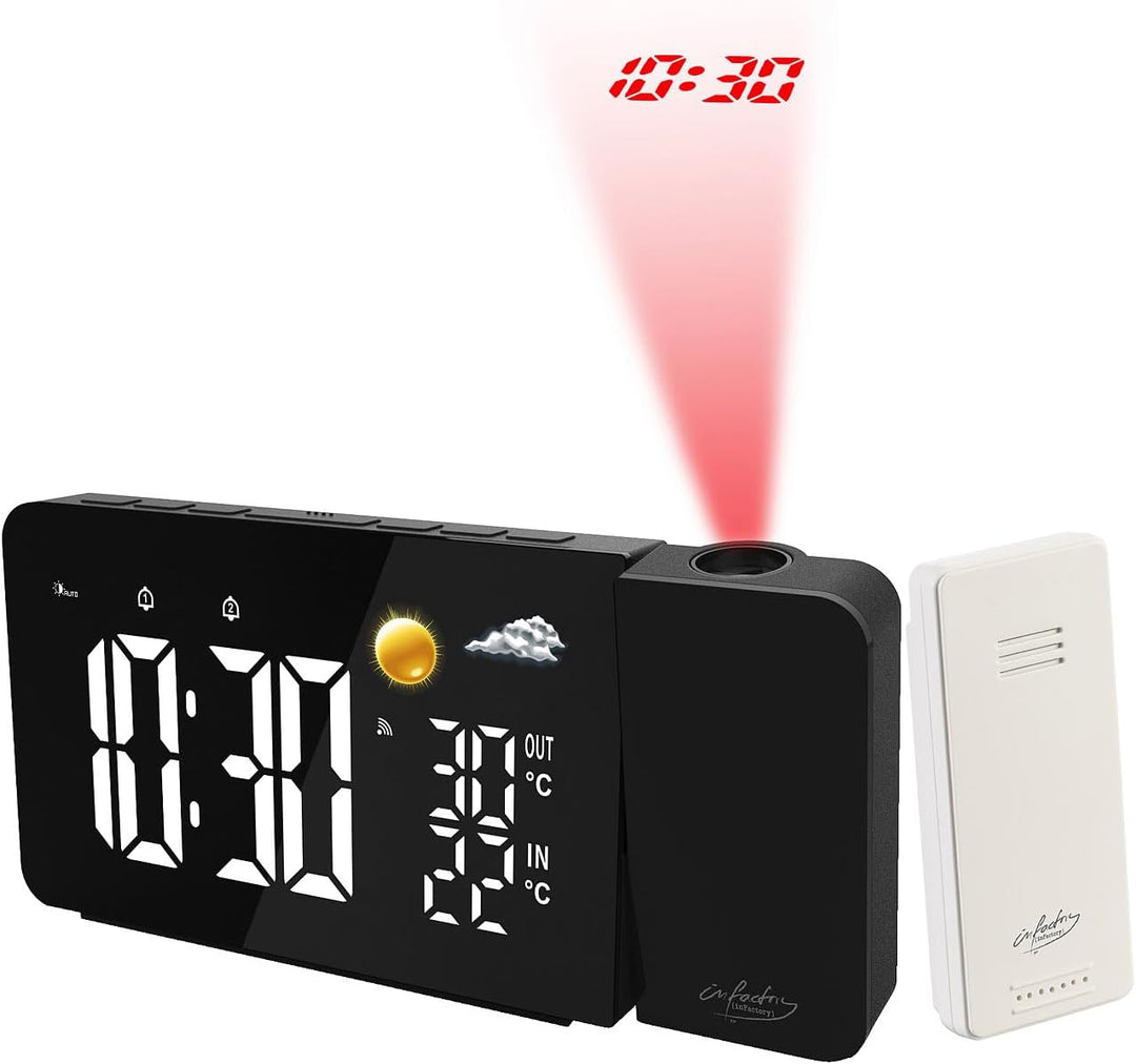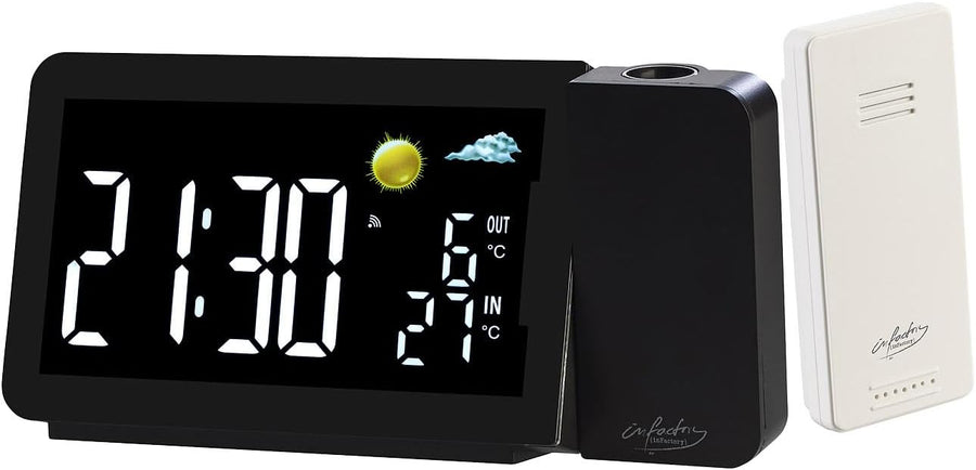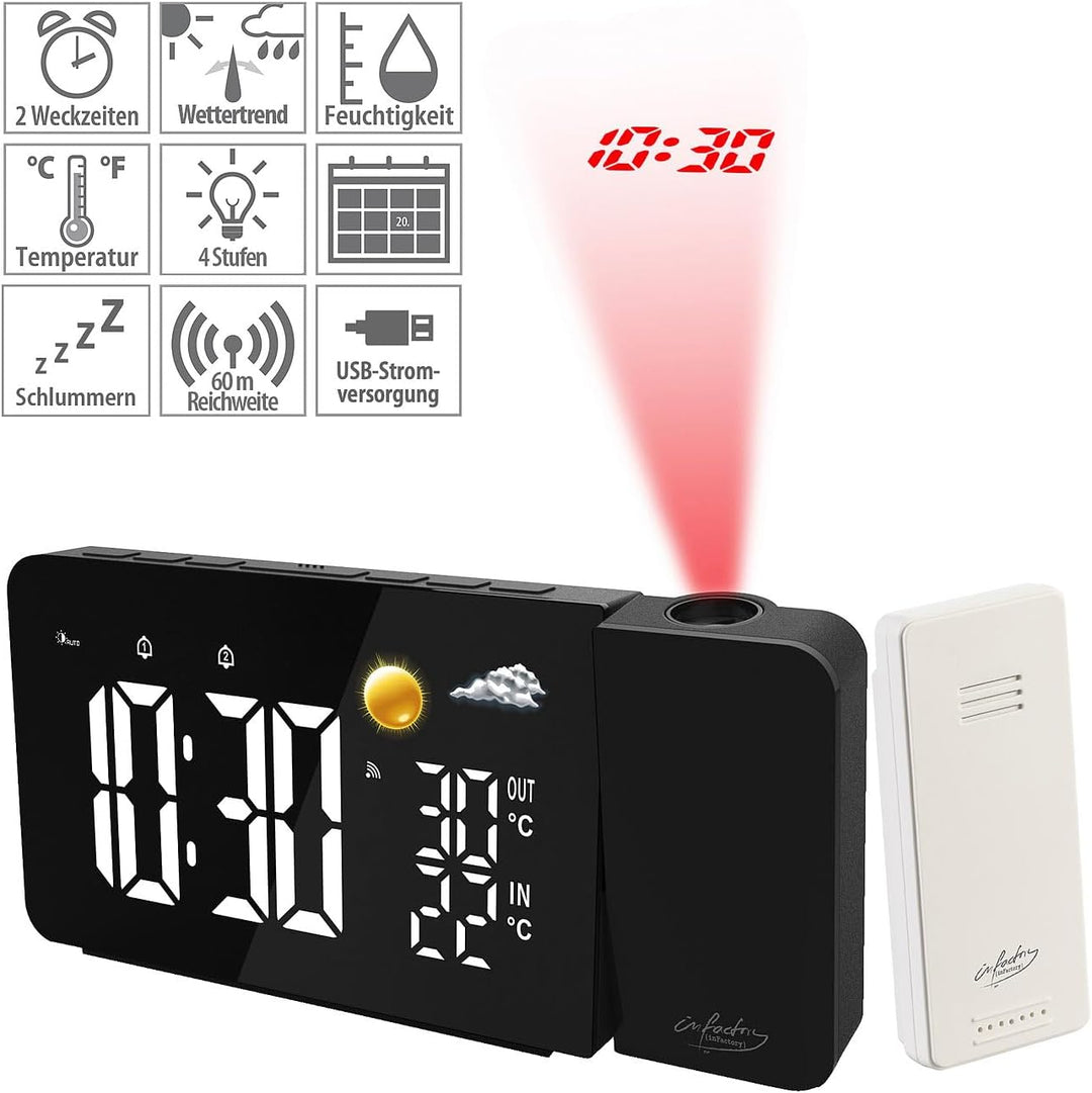 - Projiziert Uhrzeit und Temperatur an Wand oder Decke • Übersichtliches LED-Farbdisplay • Wettervorhersage dank Aussen-Funksensor mit bis zu 60 m Reichweite • 2 Weckzeiten: ideal für Wochenende und Urlaub • Schlummer-Funktion: einstellbar von 5
