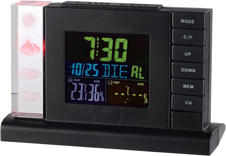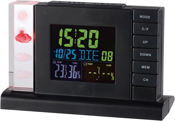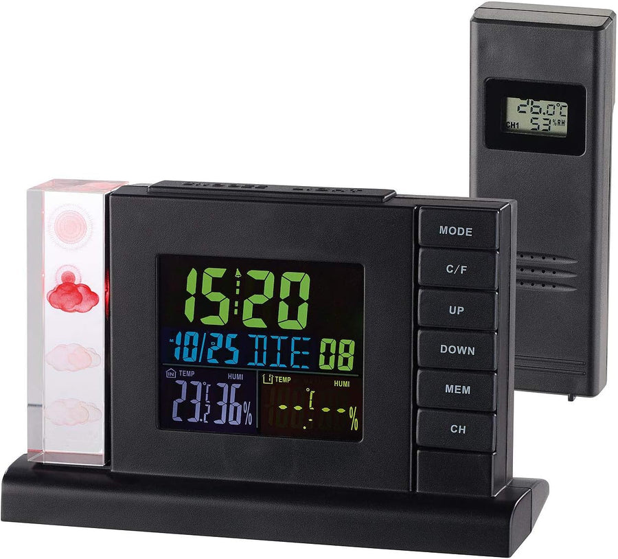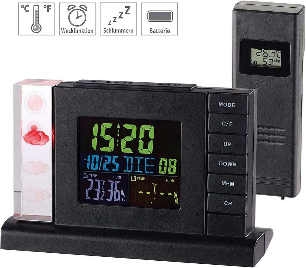 - Funk-Wetterstation inklusive Funk-Aussensensor, Netzteil und deutscher Anleitung. Wetterstation Projektionsuhr - Ausserdem relevant oder passend zu: Projektionswecker, Aussenthermometer, Crystal Cube, Projektion, Barometer, Geschenk, LED Uhr, Wetter,