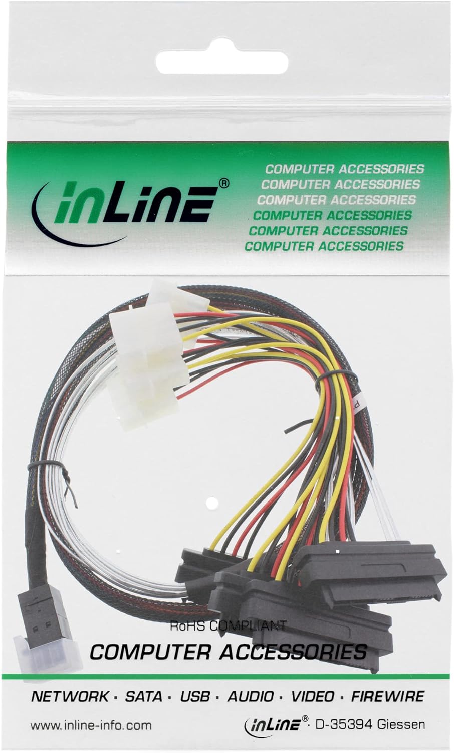 - Mini SAS HD Stecker (SFF-8643) zu 4x SAS Stecker SFF-8482 + 5,25" Stromstecker