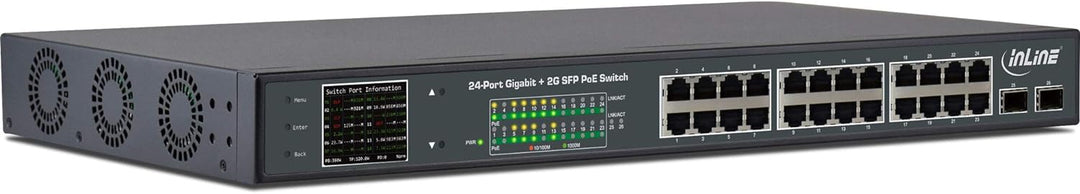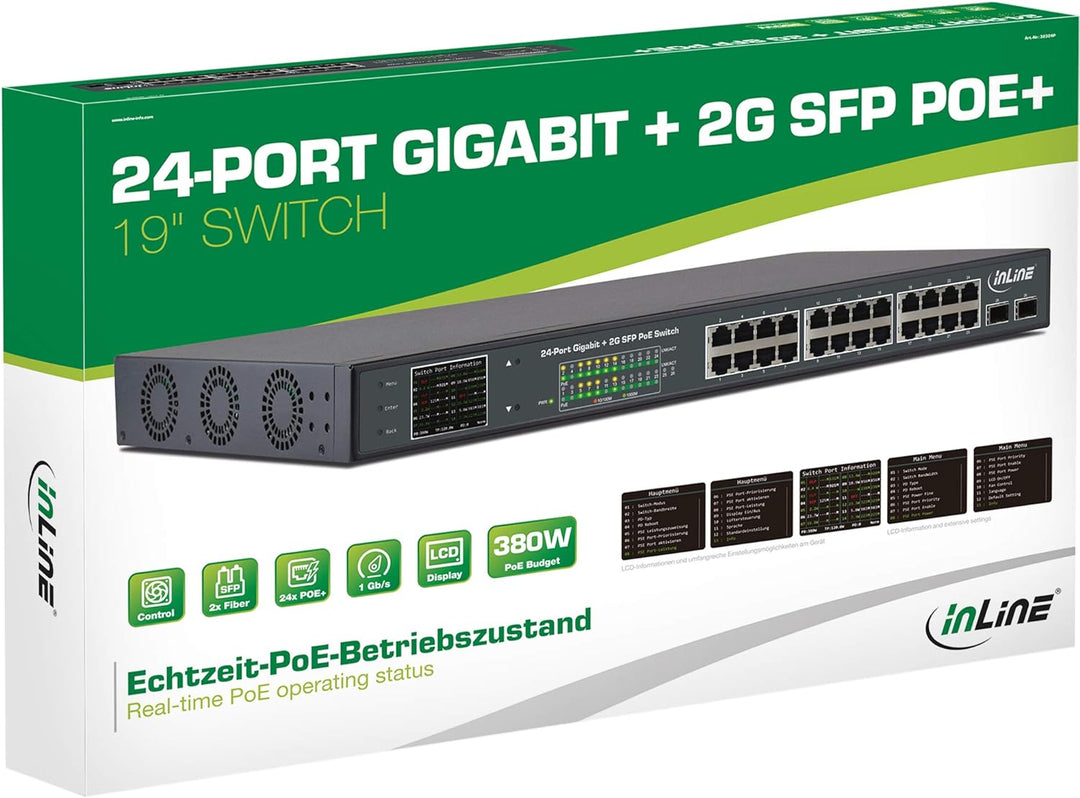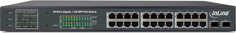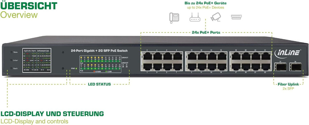 - PoE-Ports: 1-24/ PoE-Budget: 380W/ Gesamtleistung: 420W/PoE-Ausgangsleistung: Pro Port max. 32 Watt/ LCD-Anzeige: Echtzeitanzeige des PoE-Betriebszustands