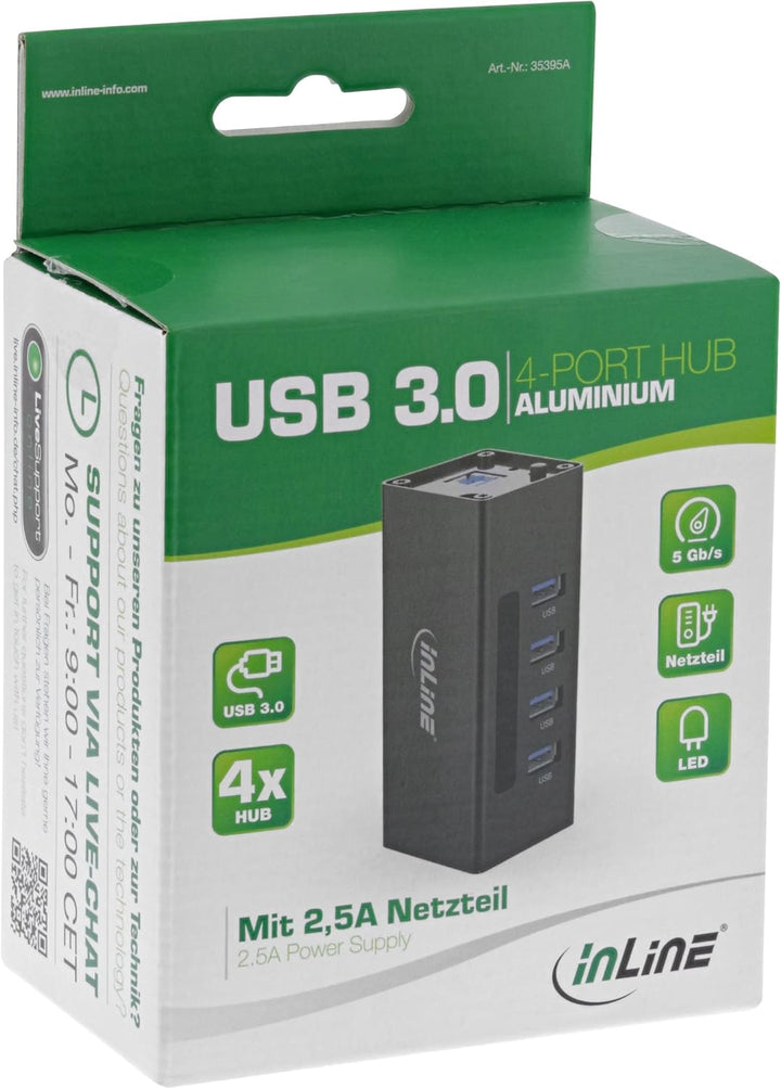 - Inhalt: USB 3.0 4-Port HUB, USB 3.0 Datenkabel, Benutzerhandbuch, Netzteil 12V/2,5A