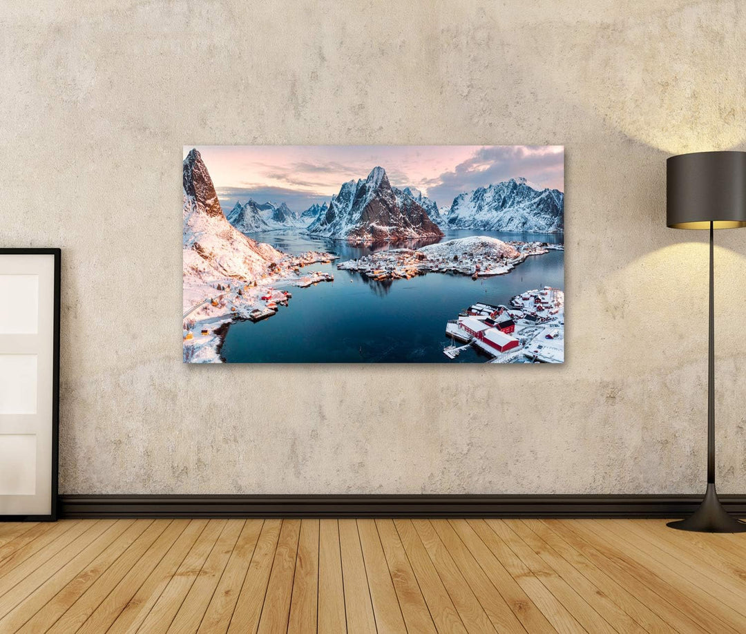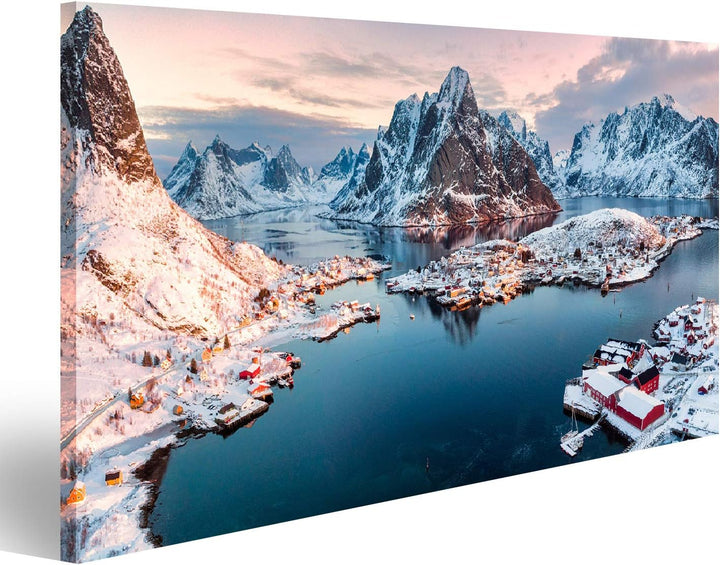 islandburner Bild Bilder auf Leinwand Vogelperspektive des Fischerdorfes in umgebenem Berg auf Winte