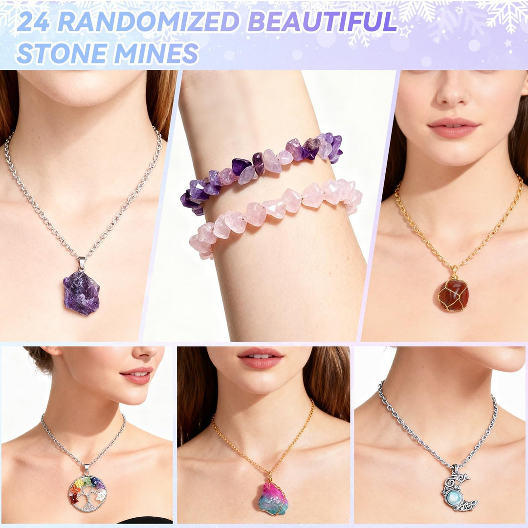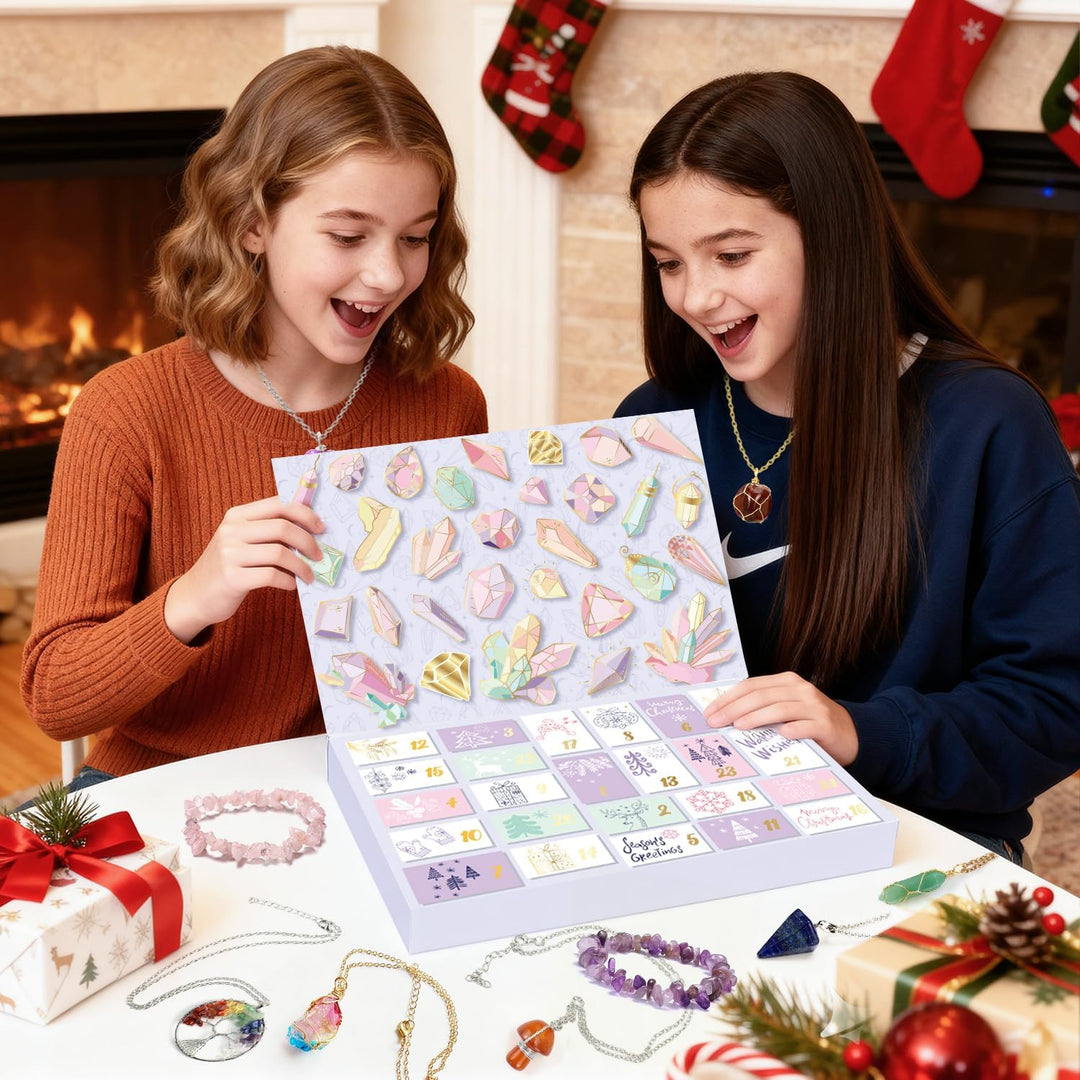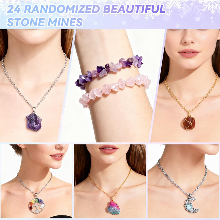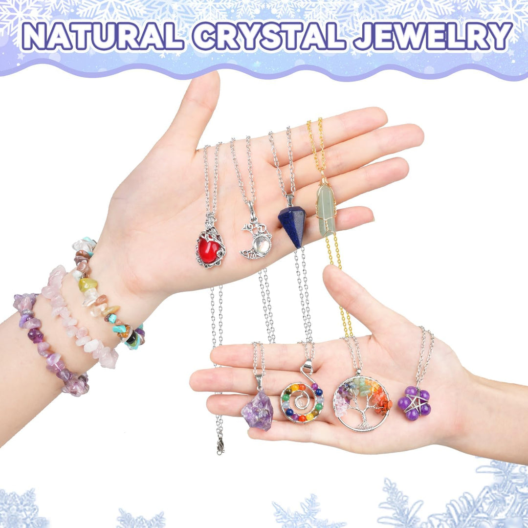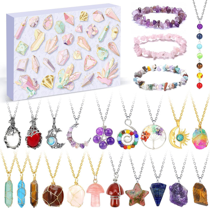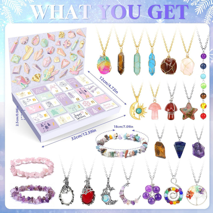 - Schmuck Adventskalender Frauen : Enthält 9 kristalle Halsketten, 12 Edelsteine Halsketten und 3 Armbänder. Jeden Tag des Weihnachts-Countdowns finden Sie ein brandneues Schmuckstück mit natürlichen Edelsteinen, hergestellt aus natürlichen Steinen