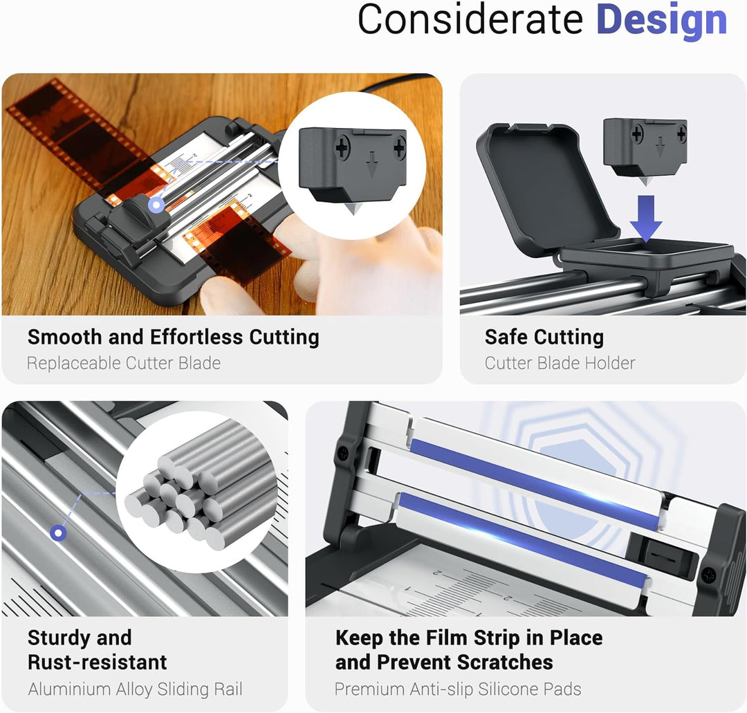 • 【Keine Kratzer Negativ】Die Kontaktfläche zwischen der Gleitschiene und der hintergrundbeleuchteten Platte ist mit hochwertigen Silikonpads ausgestattet, die den Filmstreifen fest an Ort und Stelle halten und ihn vor Kratzern schützen. Die