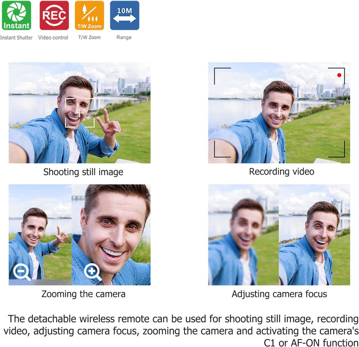 - Kabellose Fernbedienung (vom Handgriff abnehmbar) - ersetzt die Sony RMT-P1BT Fernbedienung. Reichweite: ca. 10m / 32,8' in jede Richtung, angetrieben von einer CR2032-Batterie (im Lieferumfang enthalten).