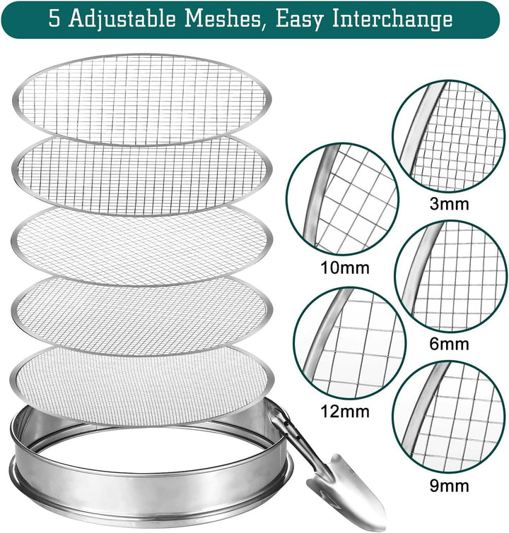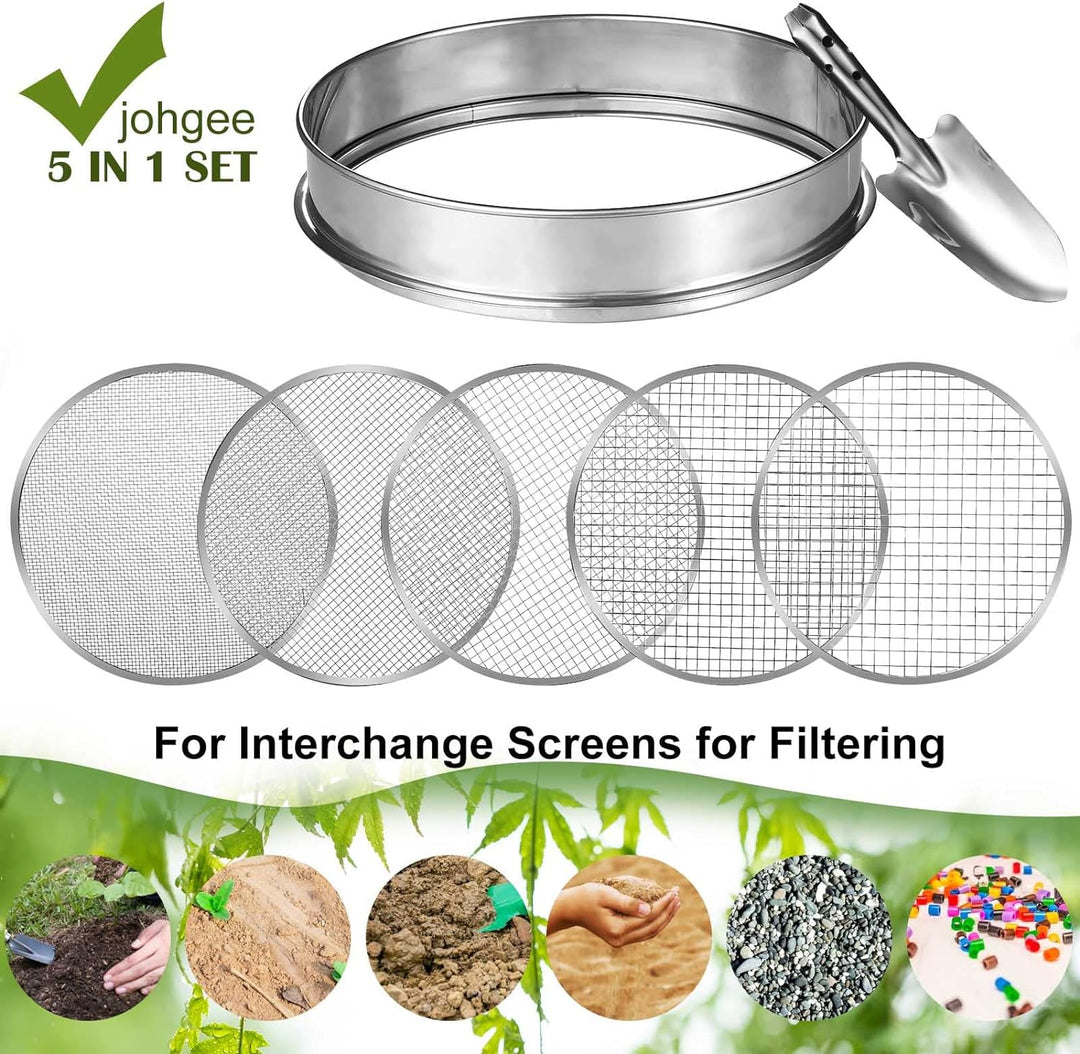 Johgee 5 in 1 Gartensieb aus Edelstahl Witterungsbeständig Sieb, mit 5 austauschbare Siebeinsätze Ø