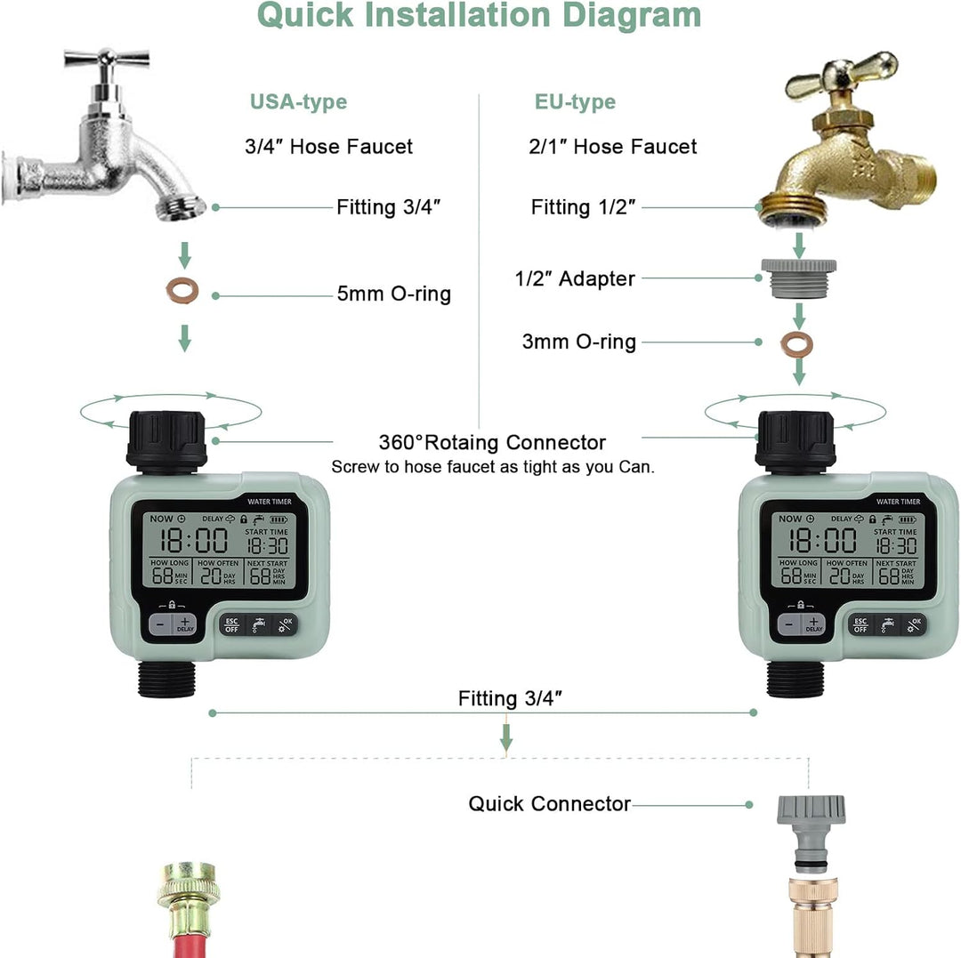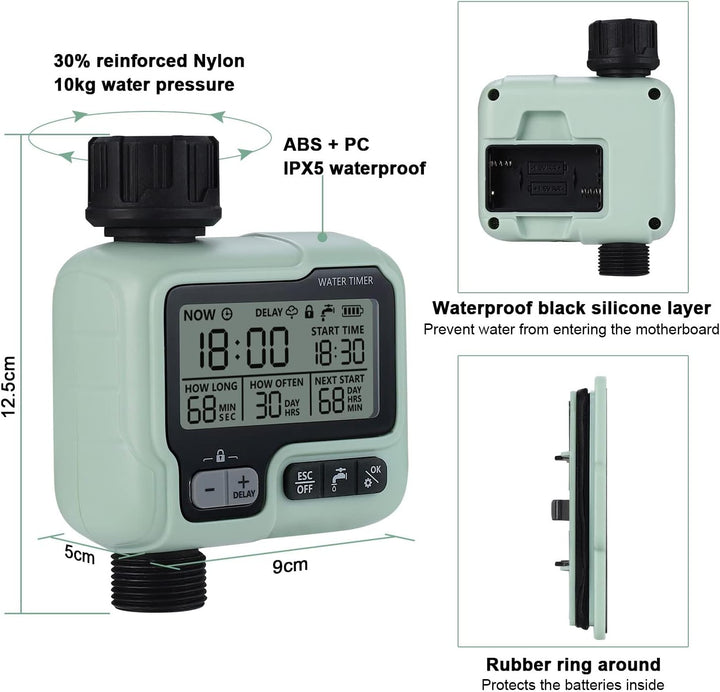 - IPX5 Wasserdicht und leckagefrei - Der obere Anschluss ist mit einem 3/4 ", Universalgewinde versehen und passt zu den meisten Schlaucharmaturen. Dieser robuste Gartentimer besteht aus 30% verstärktem Nylonmaterial, das haltbarer ist als gewöhnliches ABS-Material Exterieur und Interieur sind speziell für die Verhinderung von Undichtigkeiten konzipiert und erfüllen die Schutzart IPX5