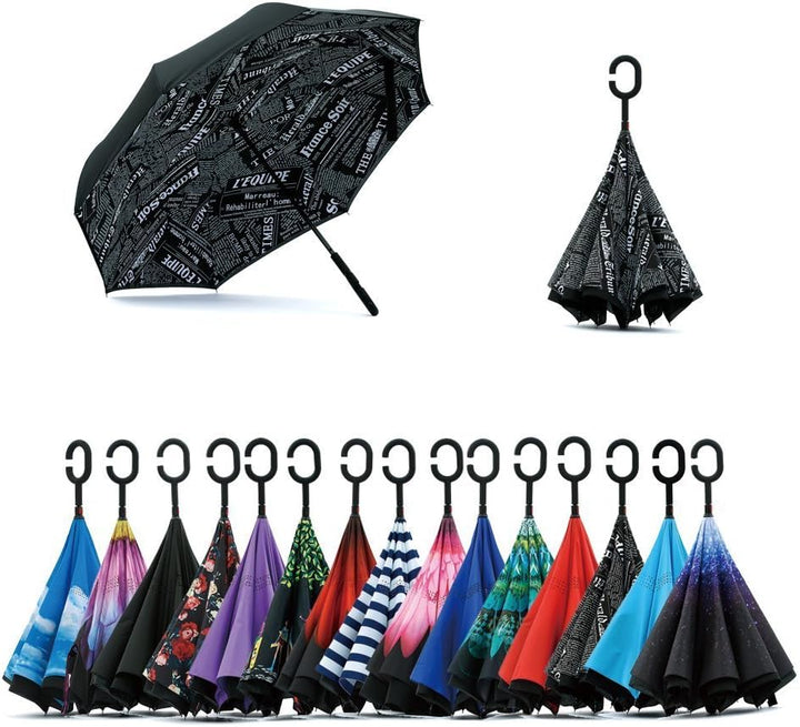 - Umdrehbarer Regenschirm: Mit nur einem Knopf öffnen Sie diesen umdrehbaren Regenschirm, und wenn Sie ihn schliessen, werden Sie nicht nass, wie sonst bei herkömmlichen Schirmen. Wenn Sie ihn schliessen, wandert die nasse Seite des Schirms nach innen,