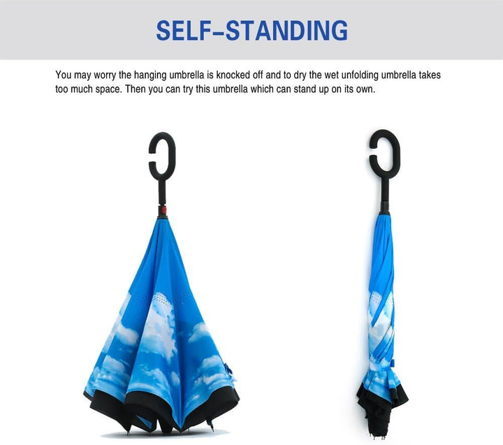 - Umdrehbarer Regenschirm: Mit nur einem Knopf öffnen Sie diesen umdrehbaren Regenschirm, und wenn Sie ihn schliessen, werden Sie nicht nass, wie sonst bei herkömmlichen Schirmen. Wenn Sie ihn schliessen, wandert die nasse Seite des Schirms nach innen,