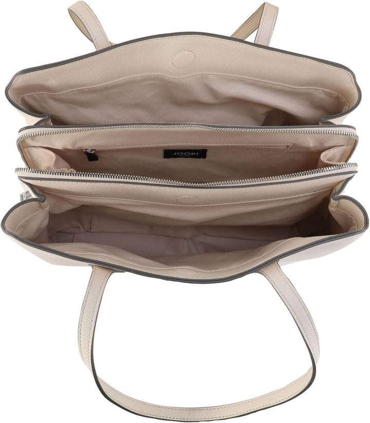 PRODUKTBESCHREIBUNGEN JOOP! Schultertasche in praktischem Format Daten Schultertasche: o Masse oben: Breite ca. 47 cm, Höhe ca. 27 cm, Tiefe ca. 9 cm o Masse unten: Breite ca. 32 cm, Höhe ca. 27 cm, Tiefe ca. 15 cm o Gewicht: ca. 560 g o Farbe: Cream White (weiss) o 2 Henkel: ca. 57 cm o Material: Polyurethan, innen Baumwolle o Lieferumfang: JOOP! Schultertasche mit Etikett Ausstattung Schultertasche: o Schultertasche wird mit Zipper geschlossen o Im Hauptfach 1 Zipperfach und 1 Einschubfach o Mit verstärktem Boden ausgestattet o Besitzt geräumiges Hauptfach o Ist gross genug für DIN A4 o Ist standfest o Das JOOP! Logo ist gut sichtbar eingearbeitet JOOP! Giro Minou Shopper - Die Schultertasche mit viel Stauraum Ob für einen gemütlichen Stadtbummel oder einen Besuch im Café mit Freunden. Mit der JOOP! Giro Minou Shopper sind Sie bestens ausgestattet. Im geräumigen Hauptfach können Sie all ihre Utensilien und Kleinigkeiten, die Sie im Alltag benötigen, bestens verstauen. Diverse extra Fächer ermöglichen Ihnen eine tolle Organisation und so behalten Sie stets den Überblick. Mit modernem Design sind Sie immer voll im Trend unterwegs und werden jede Menge beneidender Blicke anziehen. Probieren Sie es selbst! Mehr