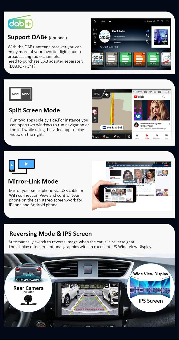 - 【MULTIFUCTION】 Bluetooth-Freisprechanruf / Multimedia-Streaming-Musik | Geteilter Bildschirm | Besseres WiFi | AM FM Radio Empfang RDS | DAB + Radio (ASIN:B083Q7YG4F) | USB-Speicher und MicroSD-Speicherkarte (bis zu 500 GB) | Lenkradsteuerung | Full