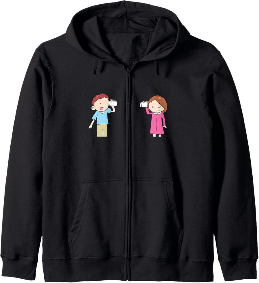 Junge und Mädchen im Gespräch durch eine Dose Telefon Kapuzenjacke