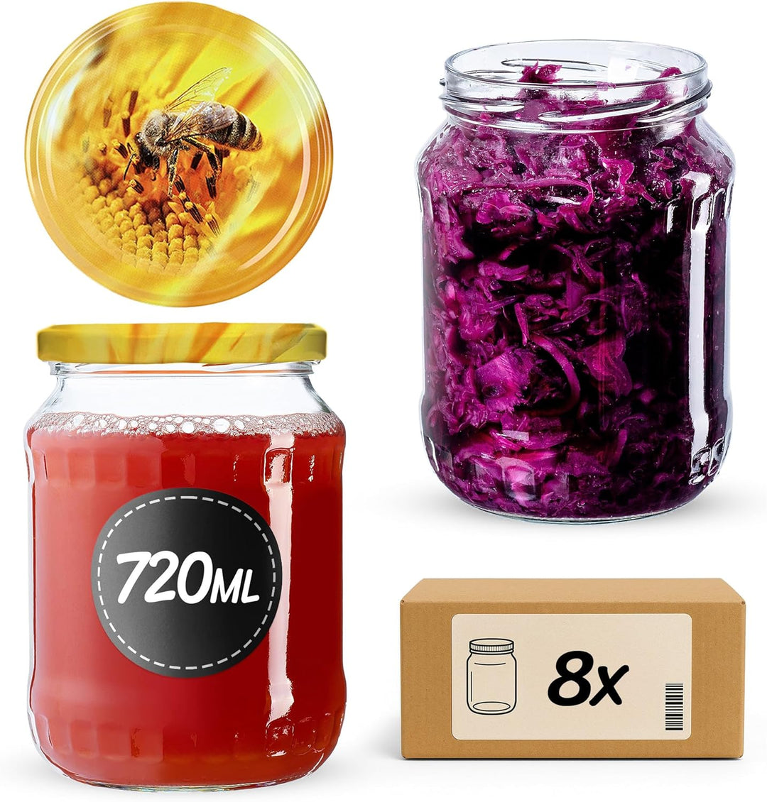 - UNIVERSAL – die Einweckgläser 720 ml eignen sich ideal für Personen, die Eingemachtes zubereiten wollen. Sie bewähren sich beim Einlegen von Gurken und bei der Zubereitung von Marmeladen, Säften, Konfitüren und Honig.