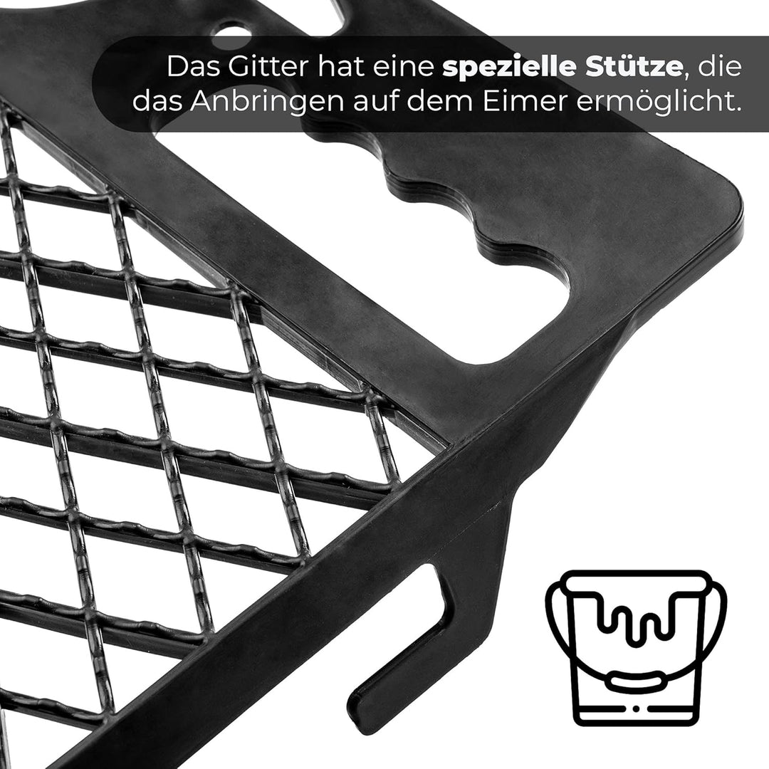 - 🖌️ DAS ABSTREIFGITTER IST EINE GROssE HILFE BEI ALLEN RENOVIERUNGS- UND BAUARBEITEN. Es soll zusammen mit einem Eimer benutzt werden. Das ist möglich dank eines speziellen Hakens am Gitter. Jedes Mal ist es möglich, dieselbe Farbmenge