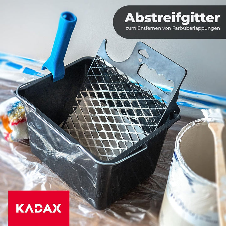 - 🖌️ DEN EIMER FÜLLT MAN BIS ZUR HÄLFTE MIT FARBE, BRINGT DAS GITTER AN UND TAUCHT DIE FARBROLLER IN DIE FARBE. Dann entfernt man den Farbüberschuss, indem man die Farbroller einige Male am Gitter abstreift. Danach kann man das Gitter am Eimer