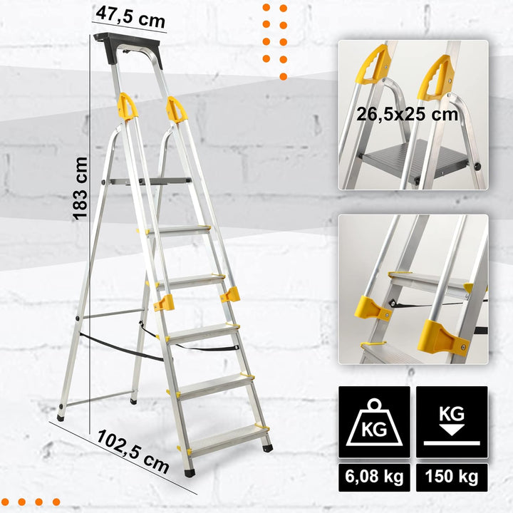 - DIE KONSTRUKTION DER HAUSHALTSLEITER IST VOR ALLEM LEICHT UND ROBUST, DA SIE AUS EINEM HOCHWERTIGEN ALUMINIUM ANGEFERTIGT IST, DAS GEGEN KRATZER UND BESCHÄDIGUNGEN RESISTENT IST. Ausserdem verfügt die Trittleiter über eine pulverbeschichtete