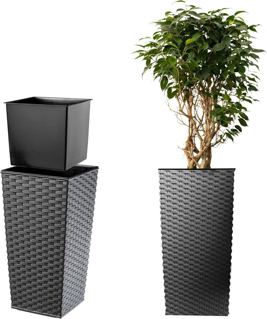 - DAS PRODUKT IST AUS HOCHQUALITATIVEM KUNSTSTOFF ANGEFERTIGT, welcher Rattan imitiert. Der Aufbau des Topfes berücksichtigt auch die Regulierung des Wasserniveuas und dank der Einlage kann man kleinere Erdmengen benutzen. Das trägt zur Funktionalität