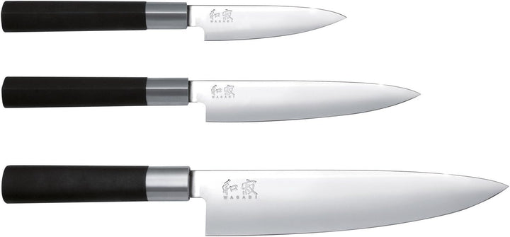 - Das Messerset enthält je ein Officemesser, ein Allzweckmesser und ein Kochmesser der Wasabi-Serie.