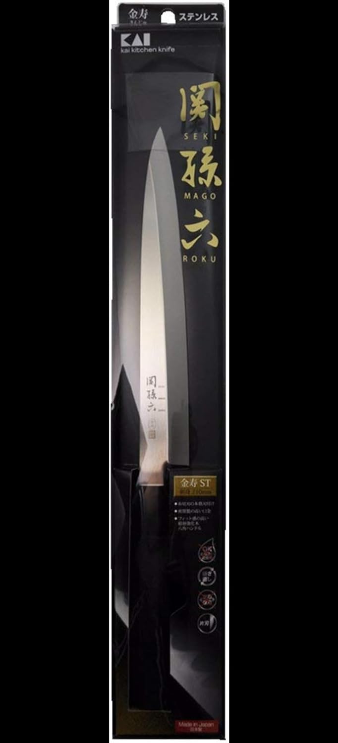 - KAI Seki Magoroku Kinju AK-1104 Yanagiba mit einer Klingenlänge von 18 cm ist speziell für Rechtshänder ausgelegt.
