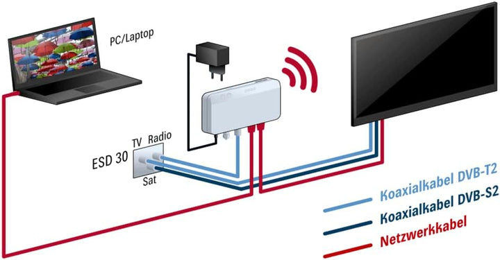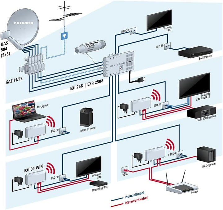 - Verwendung der bestehenden terrestrischen Koax-Verteilung zur Erstellung eines Heimnetzwerks. Es müssen keine Netzwerkkabel verlegt werden