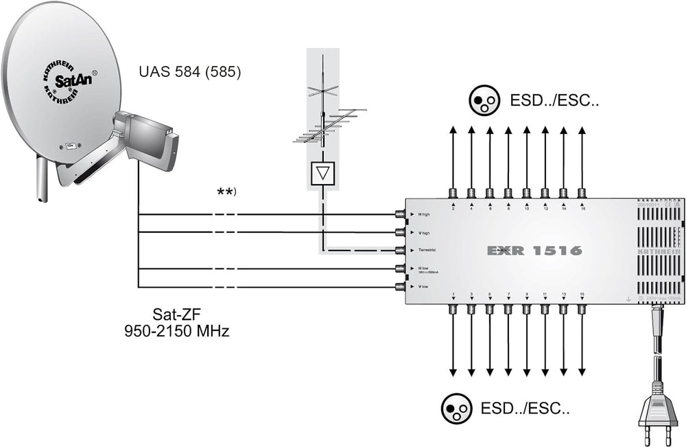 - Zur Verteilung von vier Sat-Ebenen und terrestrischer Signale auf 16 Anschlüsse
