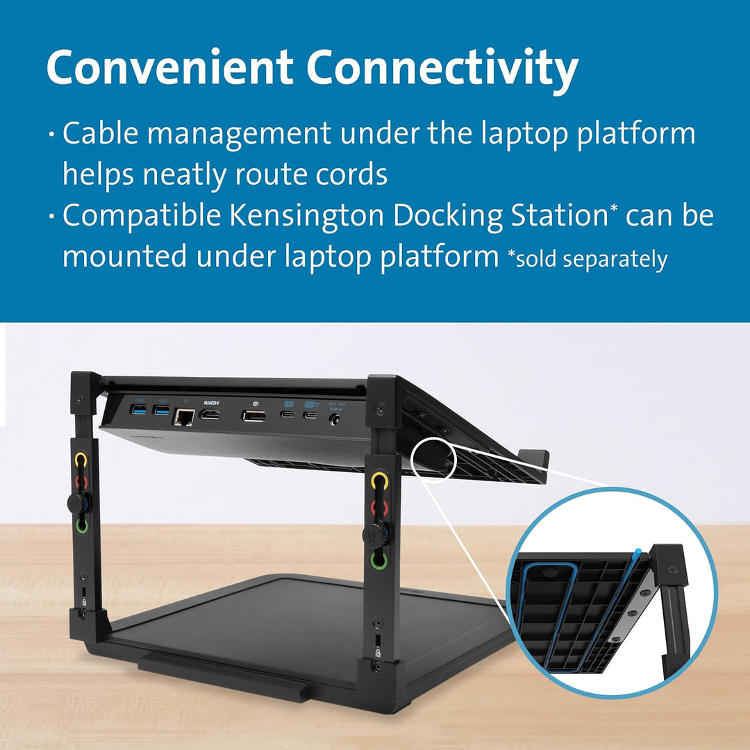 • Praktischer Docking Station Platz: Anbringen von kompatibler Kensington Universal-Dockingstation unter der Laptopablagefläche möglich; spezielle Vorrichtungen für sauberes Kabelmanagement