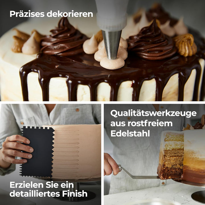 - DAS SET ENTHÄLT 2 Kunststoff Teigschaber, 1 Silikon Teigschaber, Spritzbeutel mit 14 Aufsätzen, 1 Winkelpalette, 1 Streichpalette, 1 Tortensäge, 1 drehbaren Tortenplatte aus Edelstahl