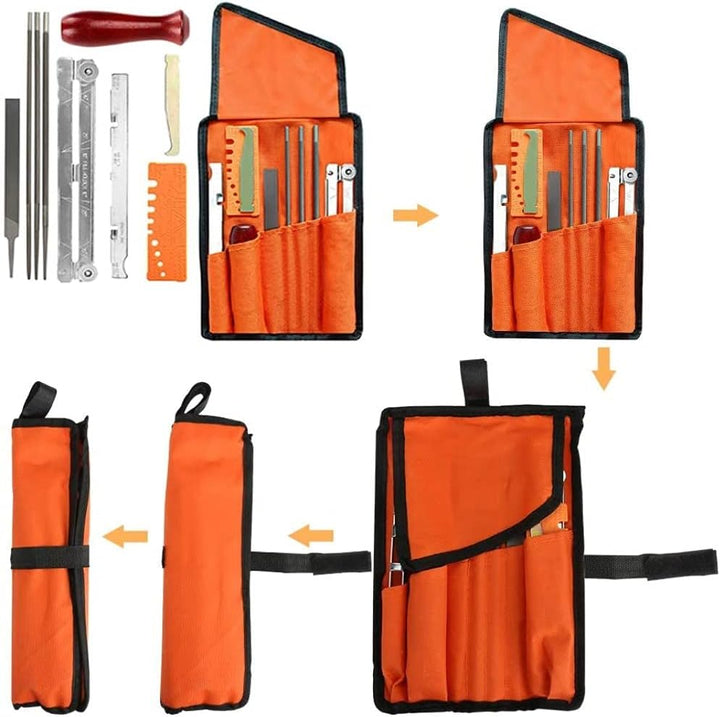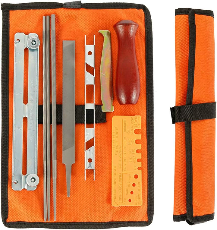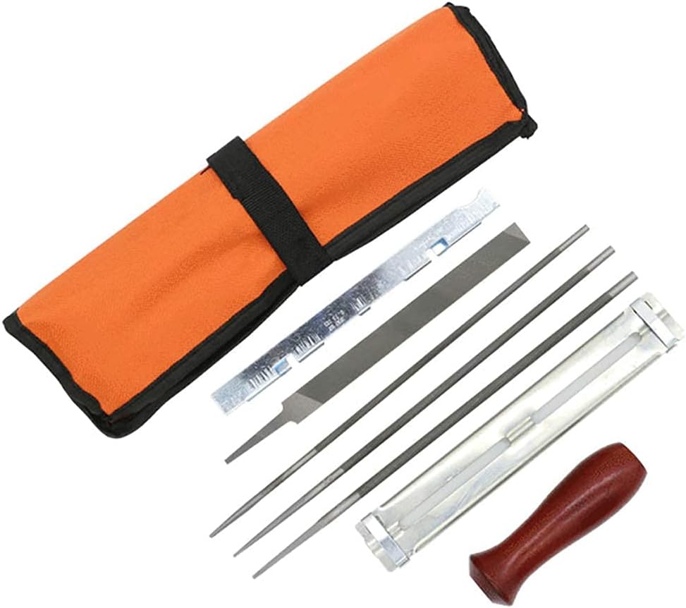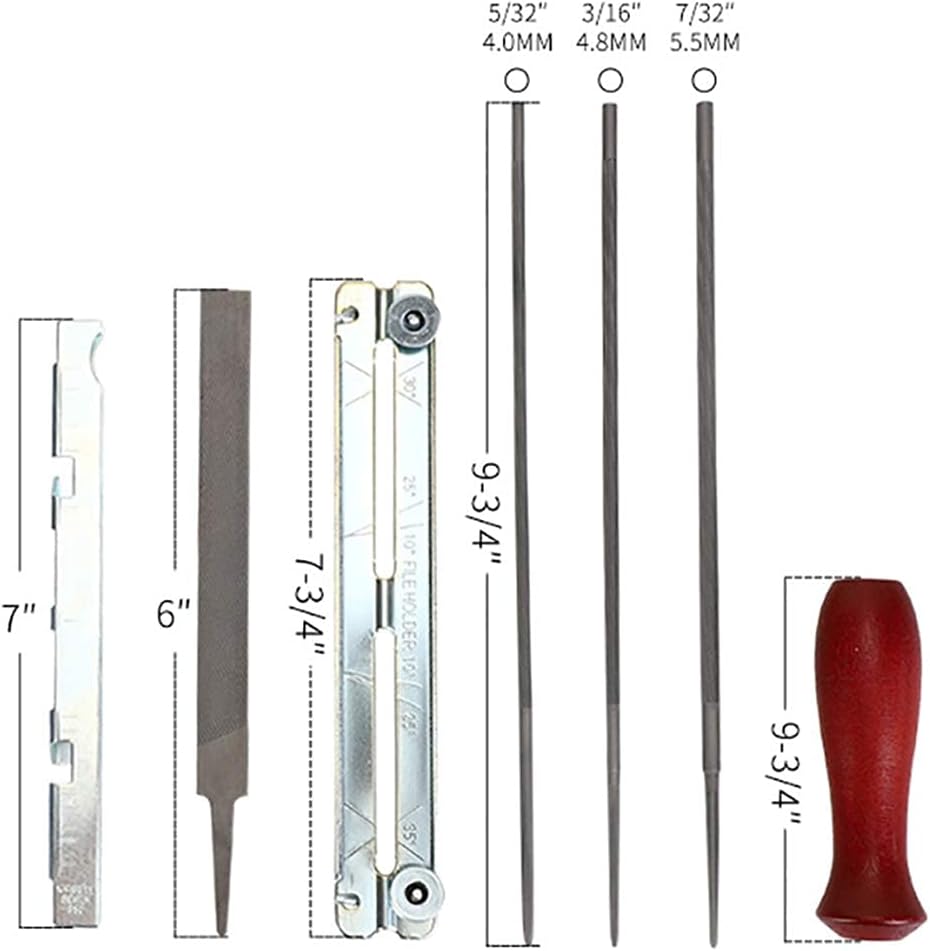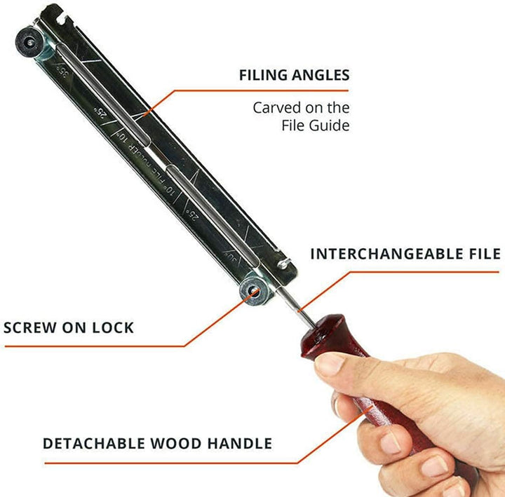 - Zum manuellen Schärfen von Kettensägeblättern, Zahnwinkelmarkierungen und Abmessungen, auf Feilenführung eingraviert und Lehren zur Ausrichtung während des Gebrauchs.