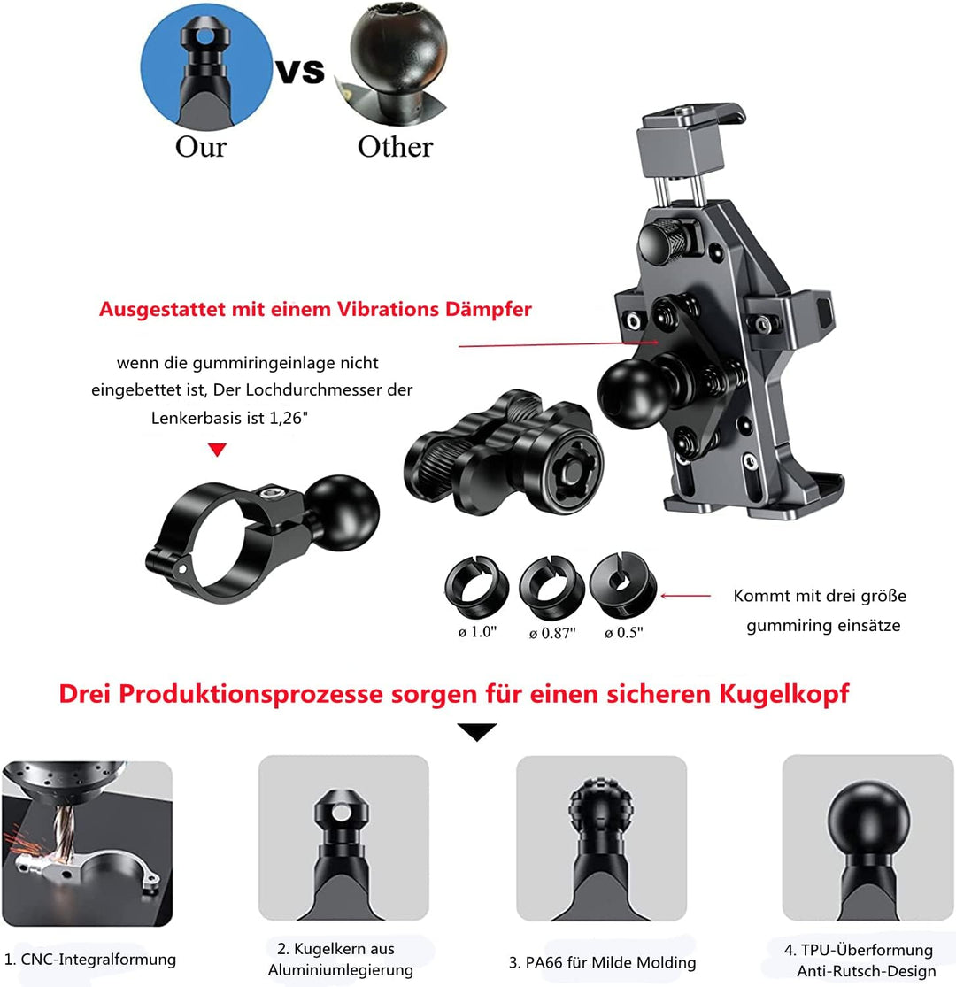 - 【Robust und Sichern】 Gemacht aus 6061-T6 Aluminiumle gierung. Motorrad Handyhalterung ist mit einem Vibrationsdämpfer und einem Anti-Diebstahl doppelsteckarm ausgestattet. Ausgestattet mit einer Lenkerhalterung aus Aluminiumle gierung. Dieser