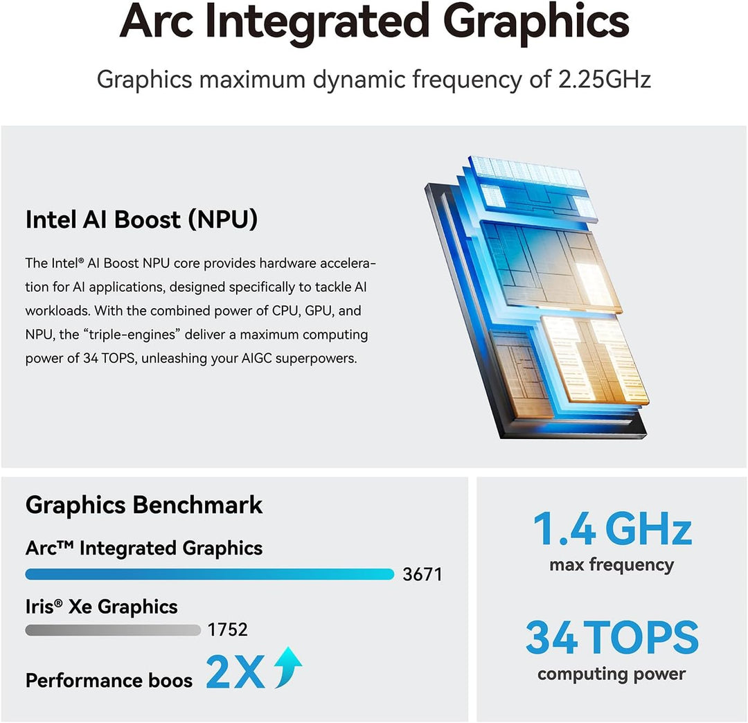 - Grafik & KI-Leistung - Geniessen Sie atemberaubende Grafiken, die von der integrierten Arc Grafik angetrieben werden, die doppelte GPU-Leistung mit einer dynamischen Frequenz von bis zu 2,25 GHz bietet. Die AI Boost NPU beschleunigt Anwendungen und