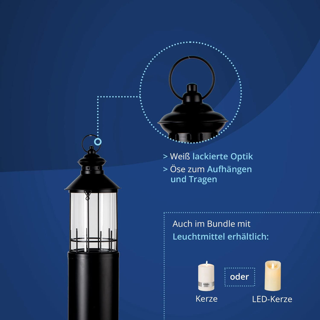 - KLASSISCH DESIGN 🕯️ klassisch, edel und originell: Diese Laterne von KHG passt wirklich zu allen Kerzen. Das schlanke Metallgestell ist durch die klassische Leuchtturmoptik ein echter Blickfang und sorgen für ein entspanntes und ruhiges Ambiente.