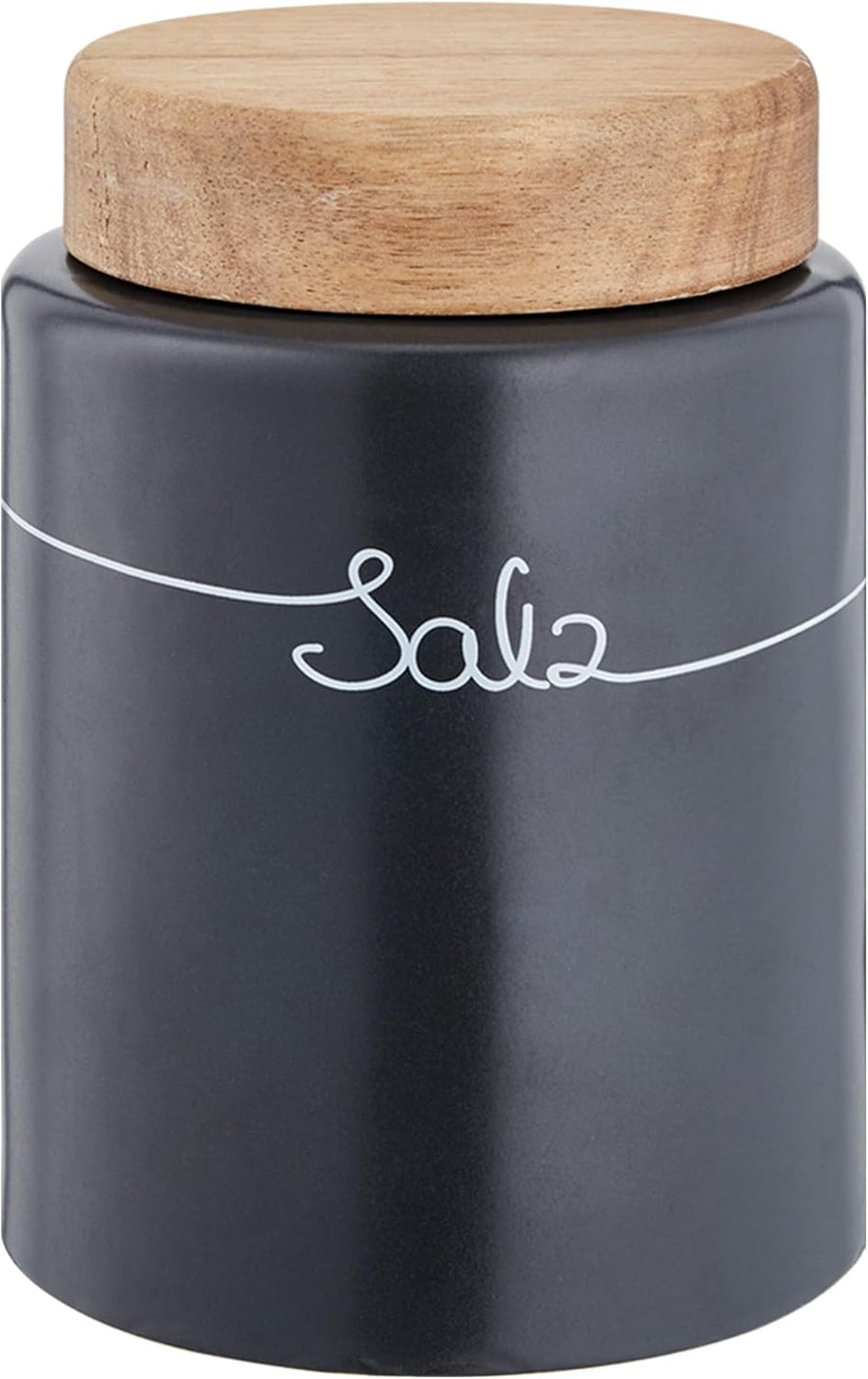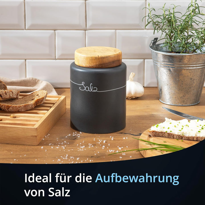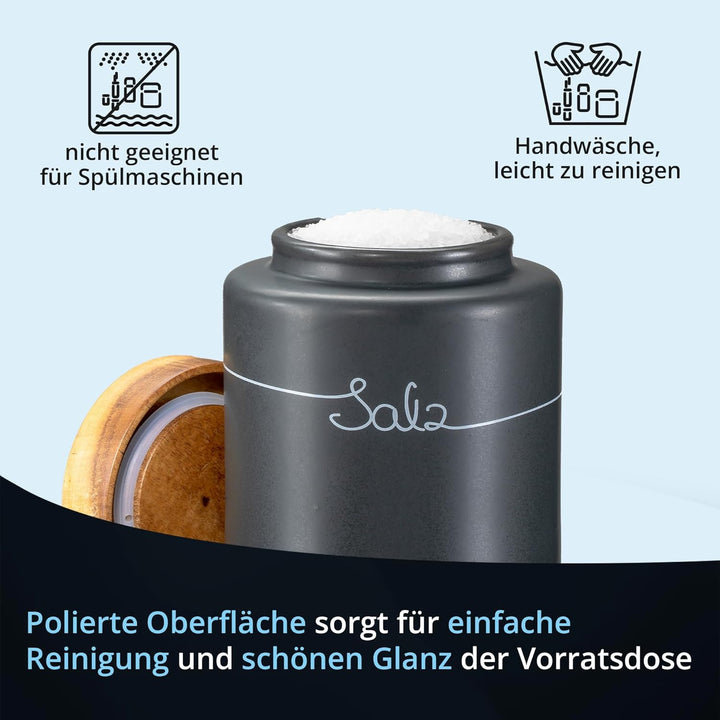 - 𝗠𝗼𝗱𝗲𝗿𝗻𝗲𝘀 𝗗𝗲𝘀𝗶𝗴𝗻 ✅ Unsere Salzdose in edlem Anthrazitgrau mit einem Holzdeckel aus echtem Bambus und einer schönen Zierschrift ist ein echter Blickfang, der sich harmonisch in jede Kücheneinrichtung einfügt.