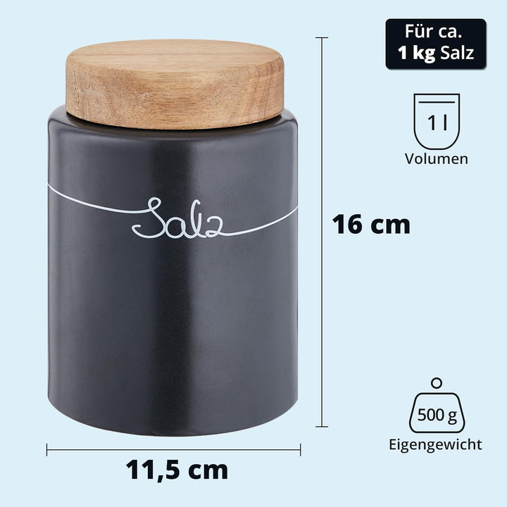 - 𝗞𝗮𝗽𝗮𝘇𝗶𝘁ä𝘁 & 𝗠𝗮ss𝗲 ✅ Mit einem Durchmesser von 11,5 cm und einer Höhe von 16 cm bietet unsere Salzdose ausreichend Platz für 1 Liter oder ca. 500g Salz. Perfekt dosierbar und immer griffbereit.