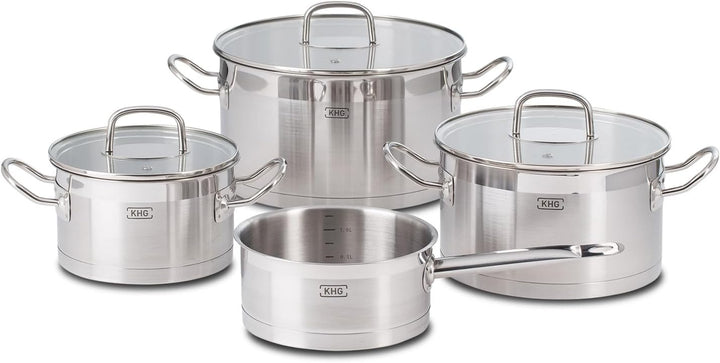 - [Vielseitiges Topfset] Dieses hochwertige Kochgeschirr umfasst drei Kochtöpfe mit Glasdeckel und eine Kasserolle, die perfekt aufeinander abgestimmt sind, um alle Ihre Kochbedürfnisse zu erfüllen. Die Edelstahlkonstruktion sorgt für eine