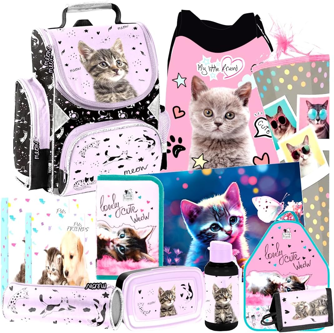 PRODUKTBESCHREIBUNGEN " Katze " 8 teiliges SCHULRANZEN-SET bestehend aus : SCHULRANZEN + SCHLAMPERROLLE + FEDERMAPPE + SPORTTASCHE + TURNBEUTEL + SCHULTÜTE + TRINKFLASCHE + BROTDOSE SCHULRANZEN: super leicht ca. 1000 Gramm Hauptfach mit dreifacher Unterteilung für Hefte und Bücher Hauptfach mit Zwei-Wege-Reissverschluss 1 Vordertasche mit Reissverschluss 1 Seitentasche mit Reissverschluss 1 Seitentasche mit Gummizug für Trinkflasche Reflektoren an einer Seitentasche und den Trageriemen Tragegriff gepolsterte, verstellbare Trageriemen ein ergonomisch geformtes und atmungsaktives Rückenpolster dazu ein stützendes Polster speziell im Lendenwirbelbereich mit stabilem, stossfestem Boden wasserabweisendes Material Material: 100% Polyester Aussenmass LxBxH ca.: 30 x 19 x 36 cm !! Innenmass Boden LxB: ca. 25 x 14 cm !! + Federmappe im Katze Design !! ungefüllt + Katze Turnbeutel ca 40 x 30 cm gross + Katze MÄPPCHEN / SCHLAMPERROLLE ca. 20 x 8 cm gross + Katze Schultüte 85 cm lang , 6-eckig, mit Tüll + Katze TRINKFLASCHE aus Kunststoff + BROTDOSE + KATZE SPORTTASCHE ca. 35 cm gross