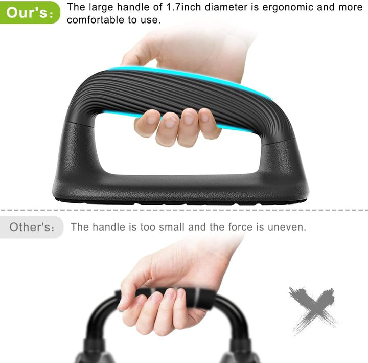 • 【Komfortabler Handgriff】 Die Liegestützgriffe sind aus hochwertigem Weichplastik gefertigt, schützen Ihre Hände, es ist nicht leicht, Schwielen zu bekommen. Der Parallettes Durchmesser ist 1 3/5 Zoll, und der Push up Bars Griff ist bequem und ergonomisch.