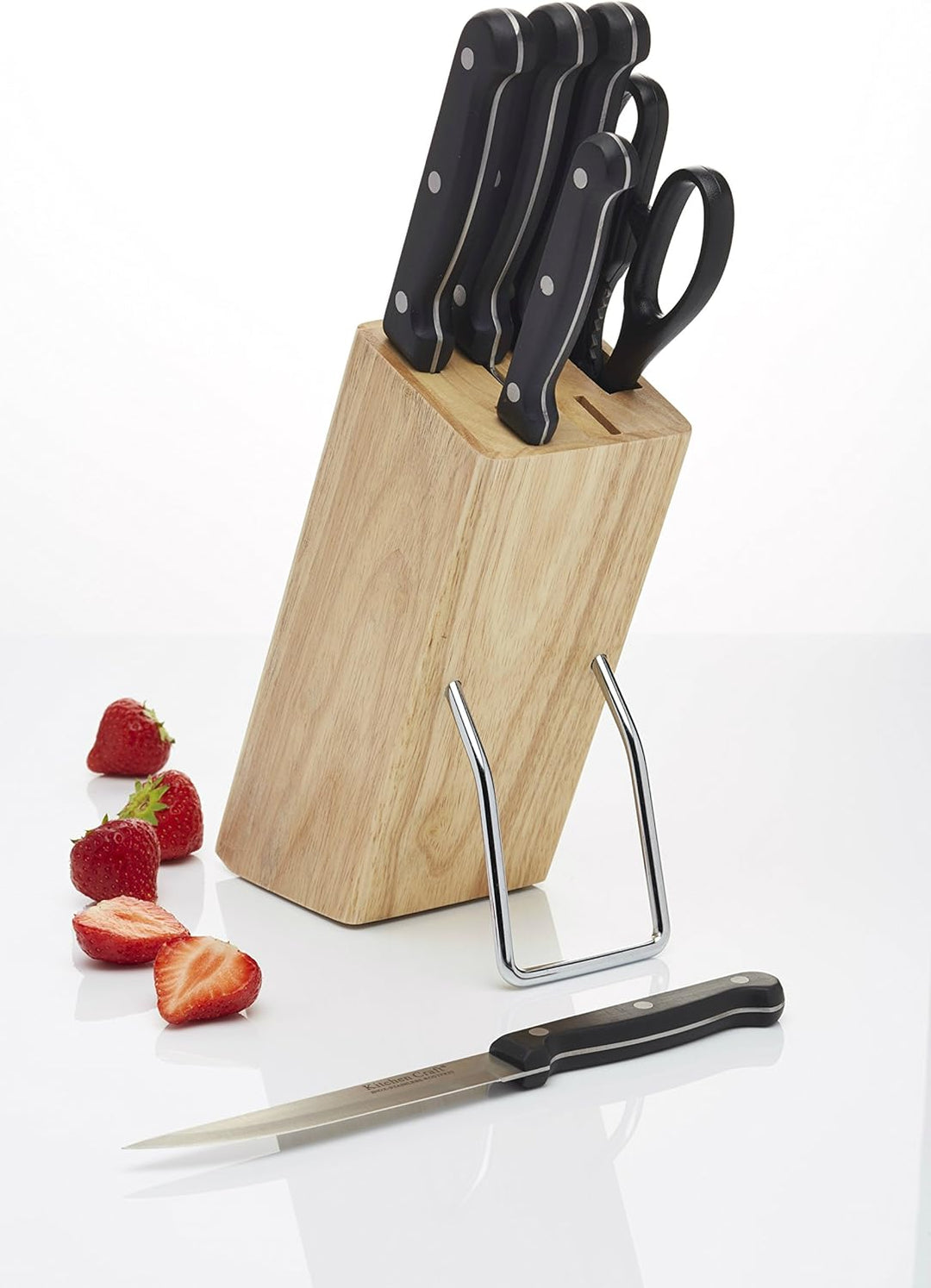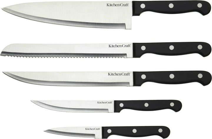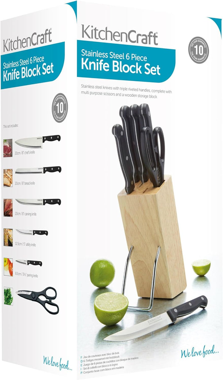 - Das Set enthält ein Kochmesser, Brotmesser, Tranchiermesser, Allzweckmesser und Schälmesser sowie eine Küchenschere