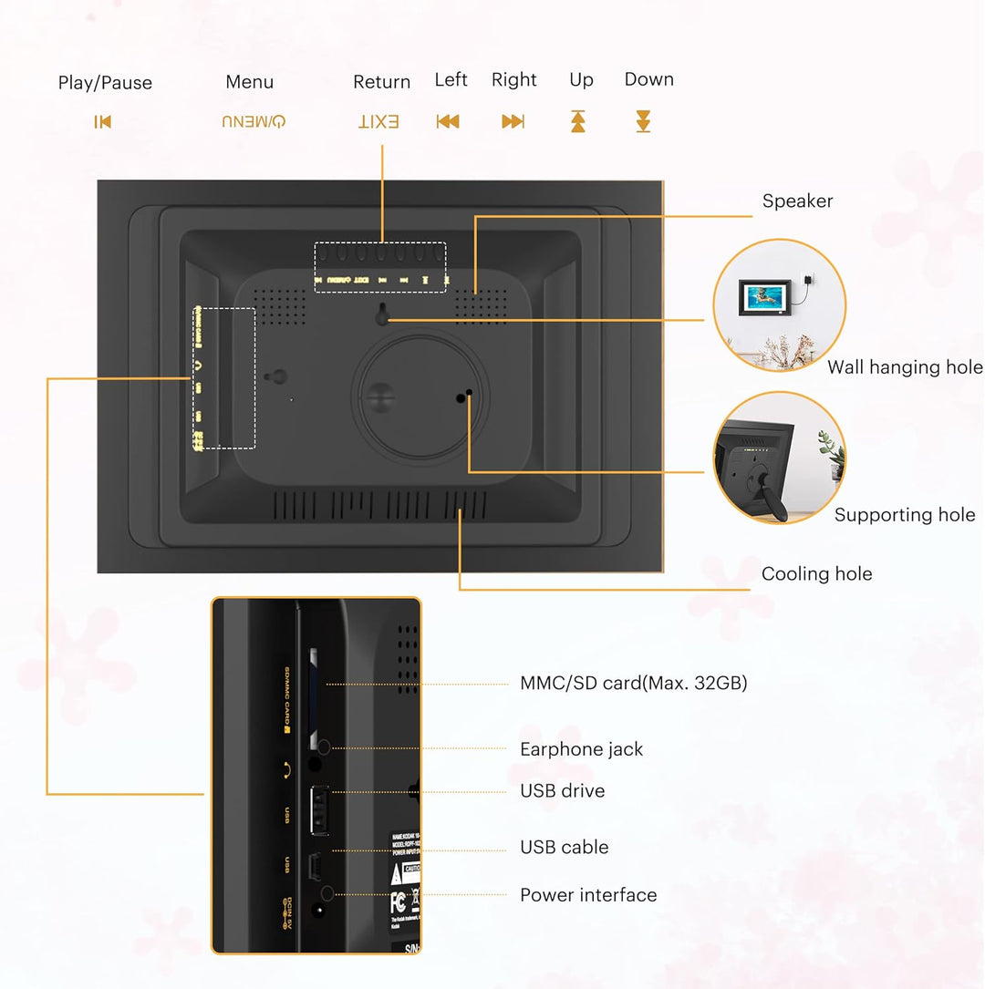 • 『Plug and Play』: Dieser integrierte digitaler bilderrahmen usb mit 8 GB Speicher ermöglicht eine enorme Speicherung des Speichers. Es unterstützt auch die SD/MMC -Karte oder USB -Geräte (bis zu 32 GB). Sie können Ihre Lieblingsfotos im digitaler