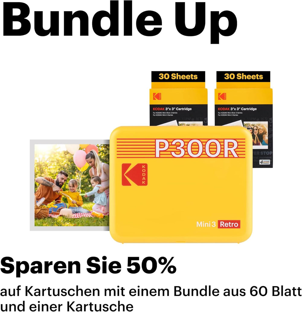 • Niedrige Fotokosten - Warum mehr für den Druck bezahlen? Es gibt keine bessere Möglichkeit, Ihre eigenen 3x3"-Fotos bequem von zu Hause aus zu drucken als unseren Kodak Mini 3 Retro-Fotodrucker. Wenn Sie ein Drucker-Paket kaufen, können Sie Fotopapier