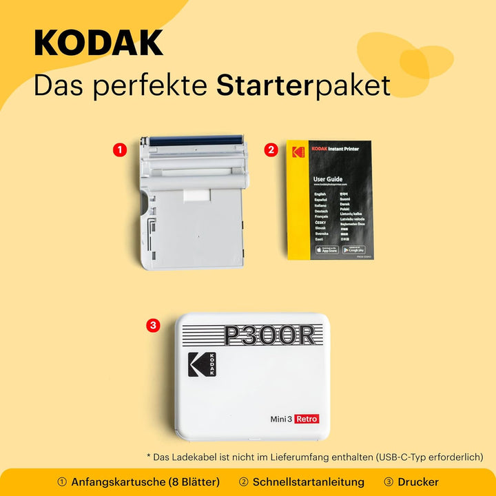 - Hervorragende Fotoqualität - Der Kodak Mini 3 Retro nutzt die 4Pass-Technologie, mit der Sie in nur wenigen Sekunden makellose Fotos drucken können. Da die Fotos auf Farbbandschichten gedruckt und laminiert werden, sind sie während der Lagerung vor