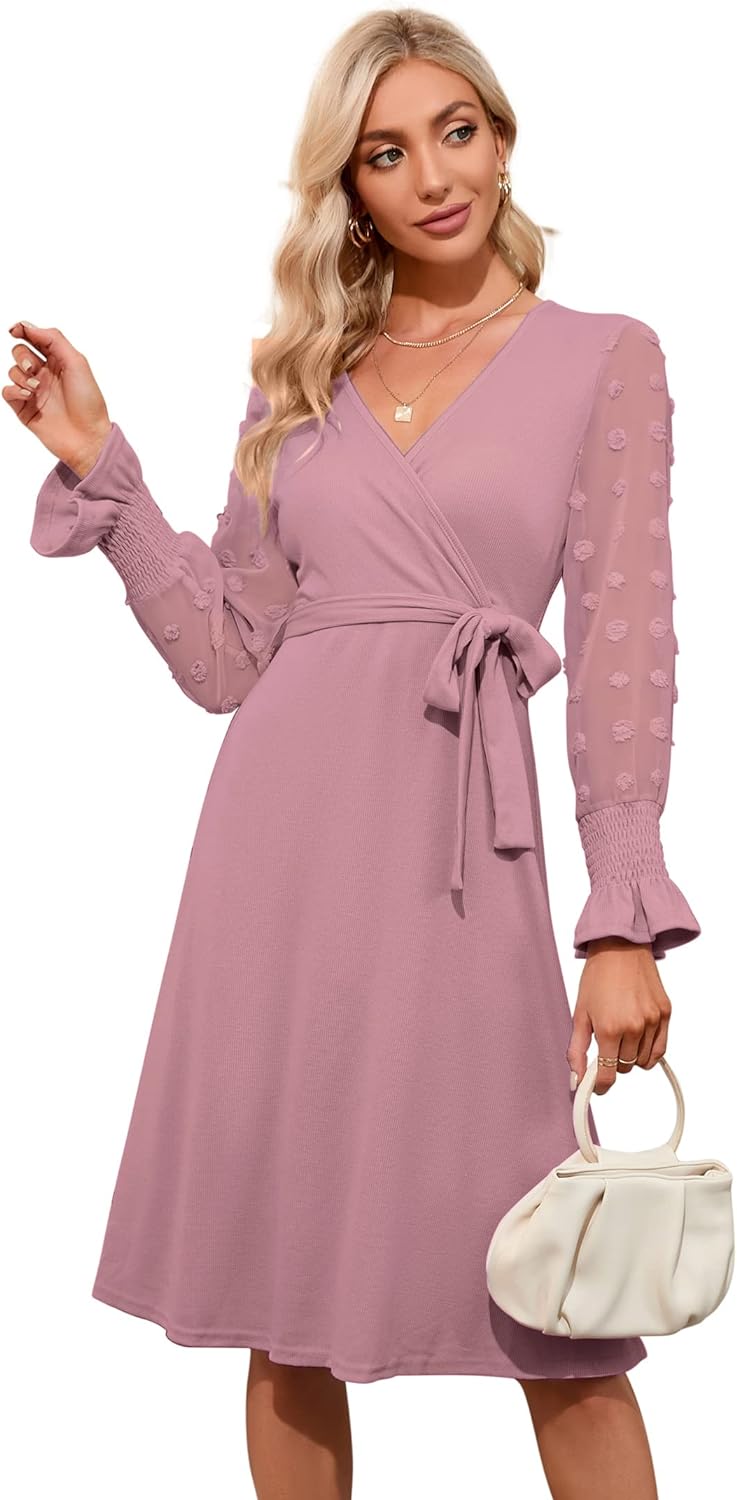 KOJOOIN Damen Kleid Strickkleid Pulloverkleid Elegant A-Line Tunika Kleid V-Ausschnitt Langarm Midik