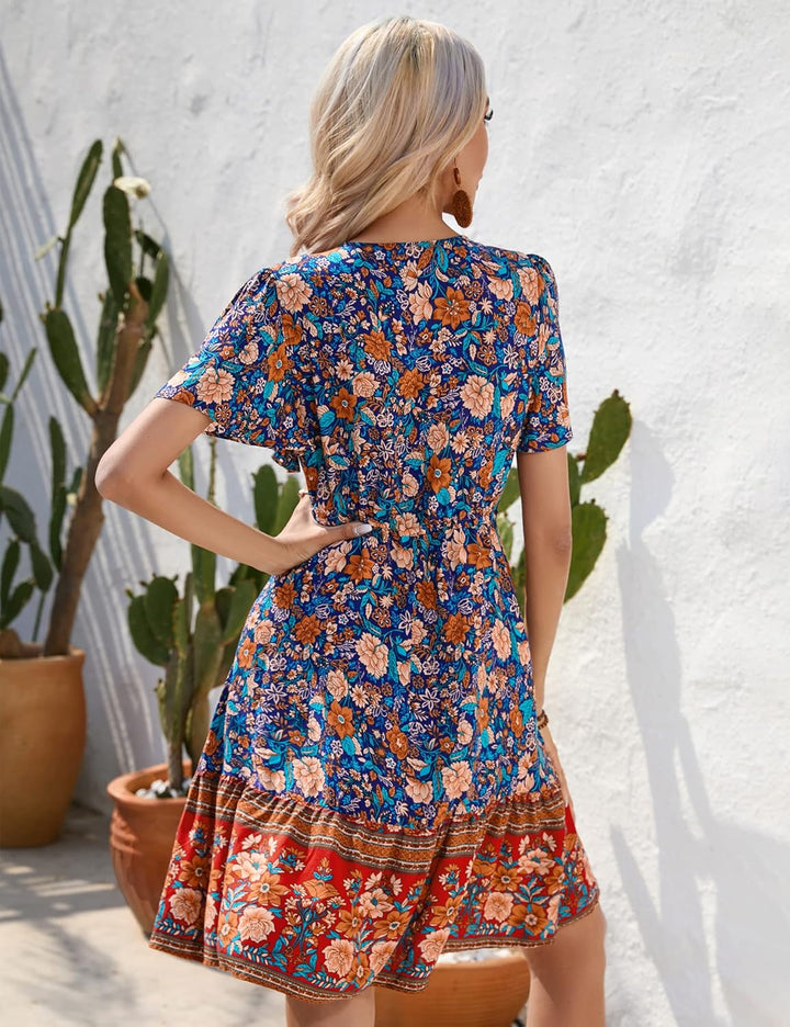 KOJOOIN Damen Sommerkleid Boho Tunika Kleid Kurzarm Minikleider V-Ausschnitt Strandkleid kurz Blumen