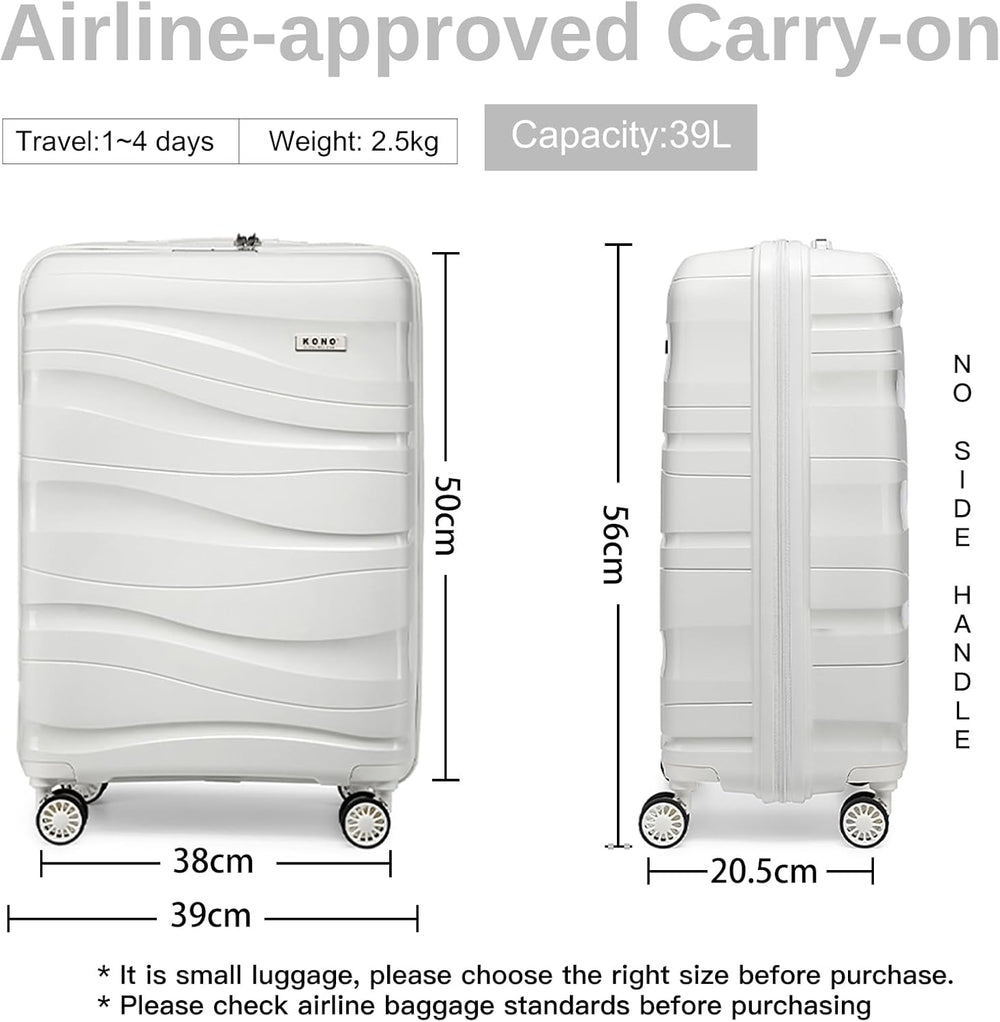 - Masse: 50,8 cm grosser Handgepäckkoffer: 55 x 40 x 20 cm (alle Teile). Fassungsvermögen: 39 l. Gewicht: 2,41 kg. Dieses Kono 50,8 cm grosse Handgepäck erfüllt Handgepäck der meisten Fluggesellschaften wie British Airways, Lufthansa, Norwegian, Jet2