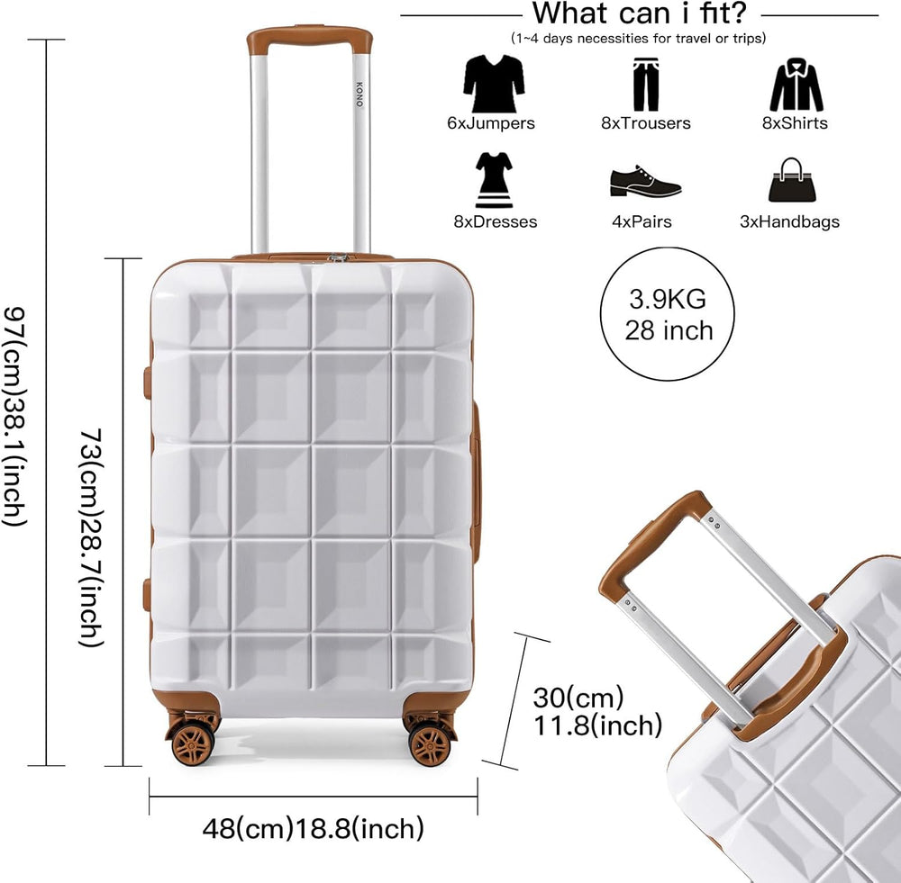 - Masse: 72 cm Koffer Gross 72 x 49 x 31 cm (alle Teile), 66 x 45 x 31 cm (Körper). Fassungsvermögen: 92 liter. Gewicht: 3,9 kg. Perfekt für den Schulanfang, Wochenendausflüge oder als internationale Reisen. Unsere Kono-Koffer durchlaufen strenge