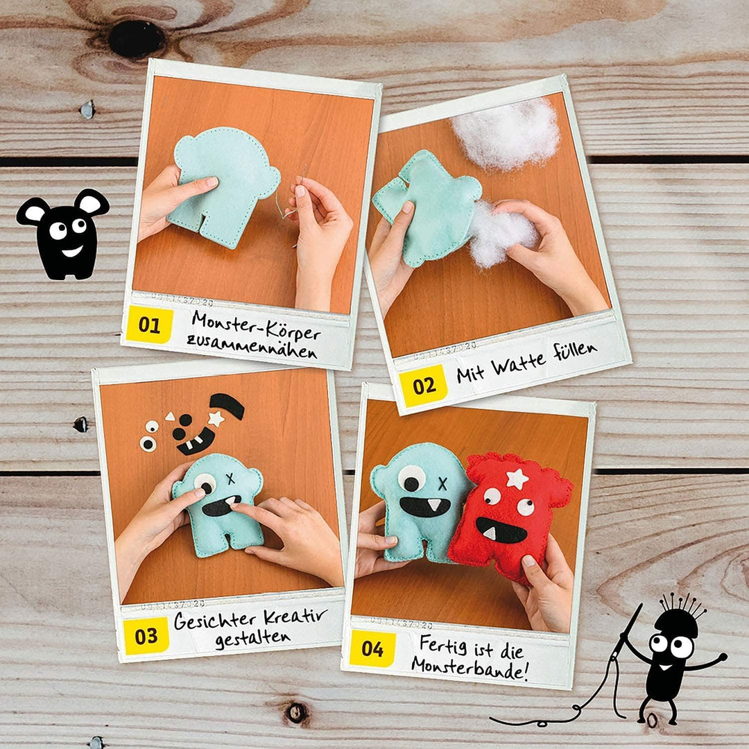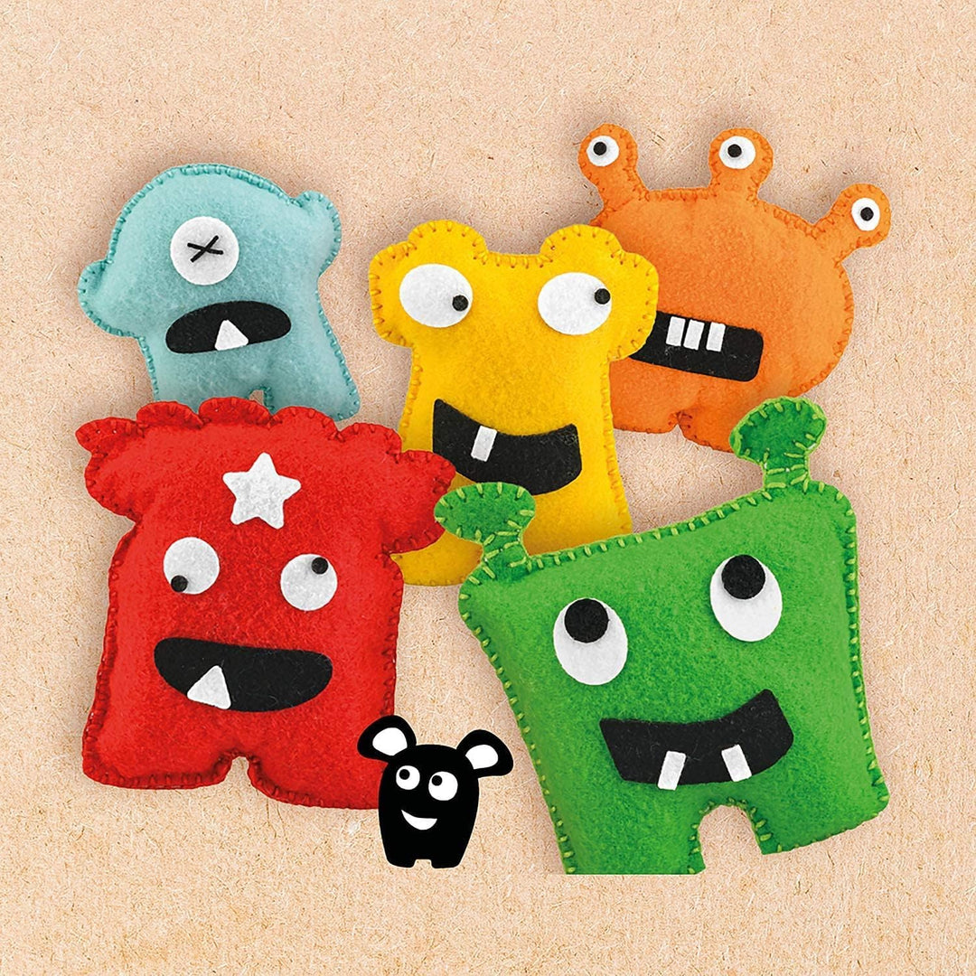 - Für Einsteiger geeignet: Vorgestanzte Monsterformen, selbstklebende Verzierungen aus Filz und die supersichere, stumpfe Nadel sind für jüngere Kinder besonders leicht zu handhaben. Erfolgserlebnis garantiert