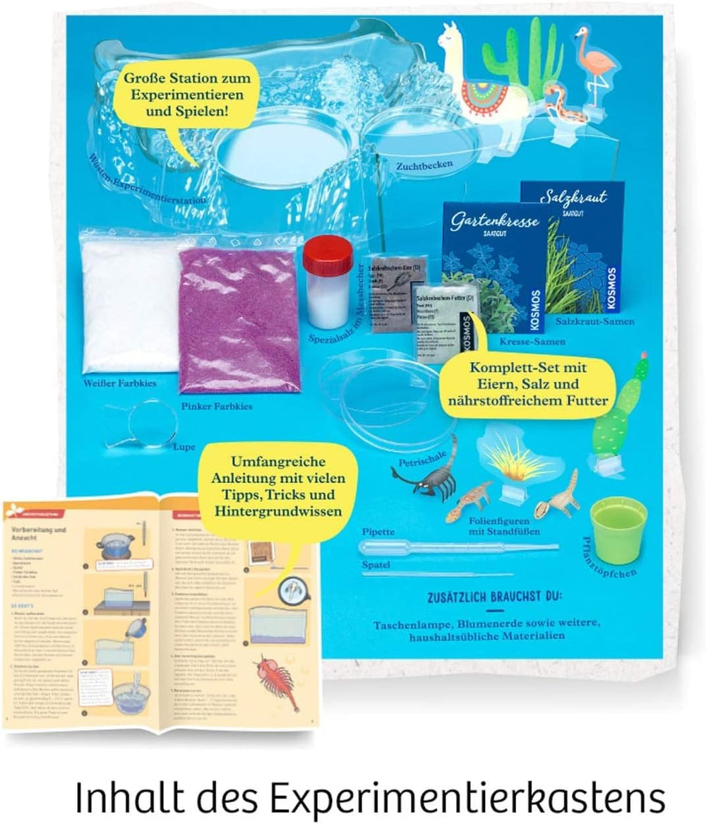 - Dieser Experimentierkasten enthält eine coole Salzwüsten-Experimentierstation mit speziellem Hochbecken. Ideal zum Züchten und Beobachten der flinken Urzeitkrebse