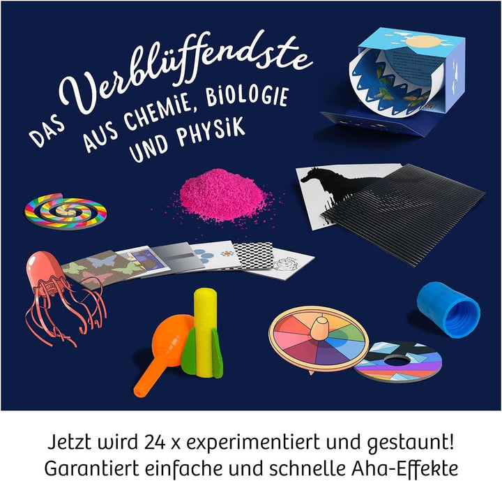 - In jeder der 24 liebevoll gestalteten Mini-Boxen steckt ein spannender Versuch – egal ob Physik, Biologie oder Chemie, hier begeistern tolle Phänomene!